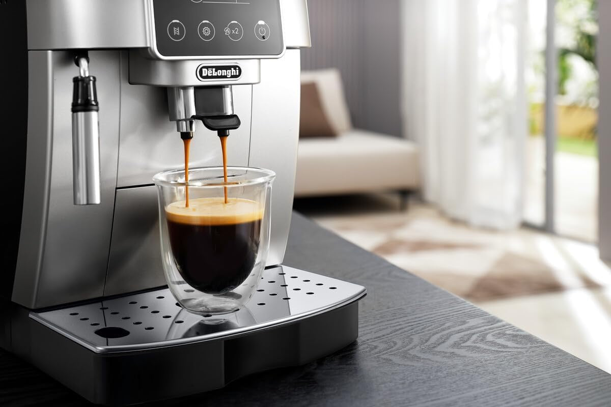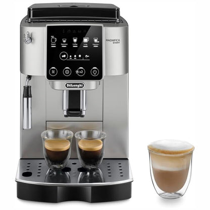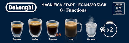 Delonghi Espresso Machine with 15-bar pressure and a 250g bean container, perfect for brewing espresso, coffee, and long drinks effortlessly. Features a Cappuccino System for creamy milk froth, soft-touch controls, and customizable length and aroma options. Compatible with pre-ground coffee and water filters, it comes in a sleek Silver-Black design with a stainless-steel cup holder.