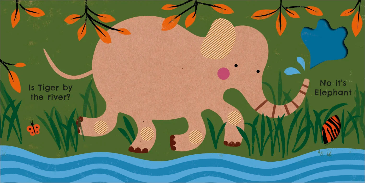 Is Tiger by the river? No, that's Elephant. Can you hear squawking coming from the treetops? Tigers don't squawk, that's Parrot. Only on the last page, will Tiger reveal himself. Your toddler will love meeting all of Tiger's friends in this imaginative educational book.