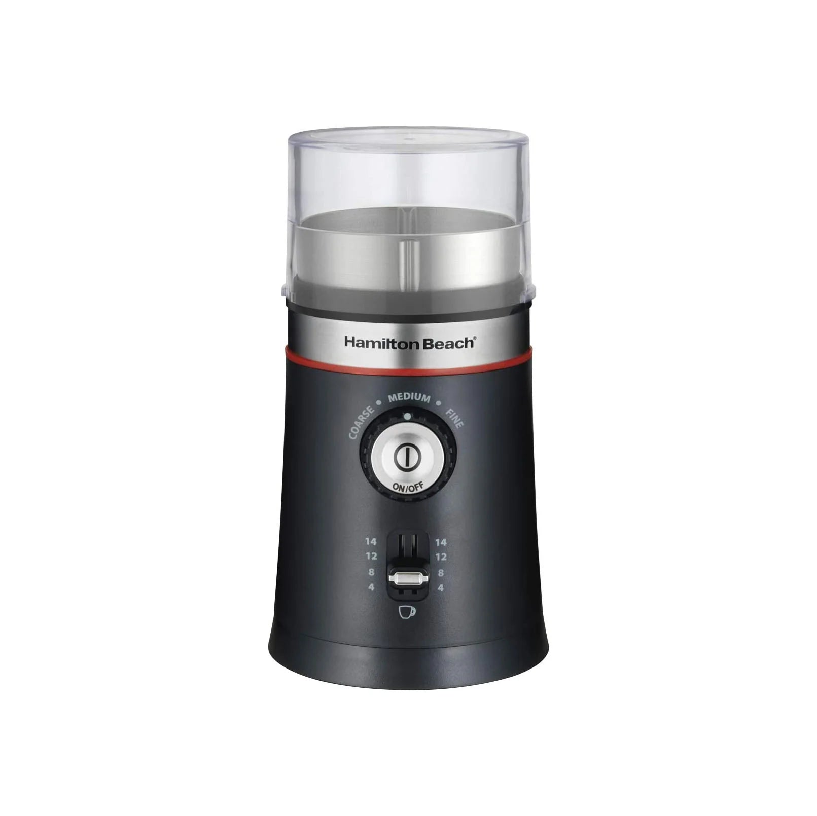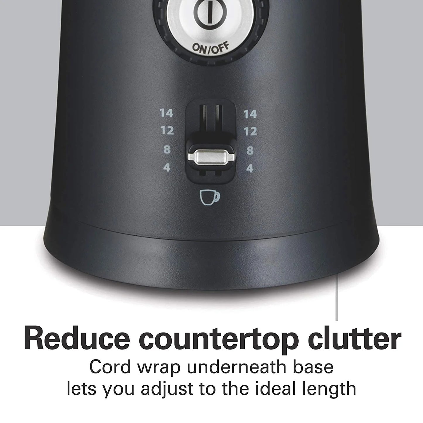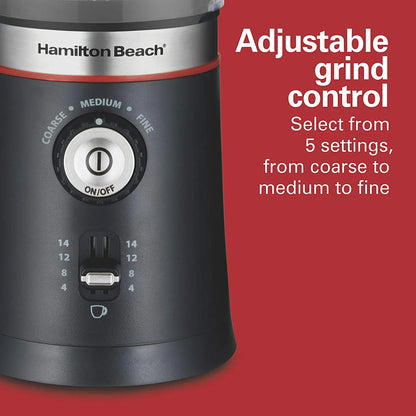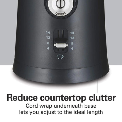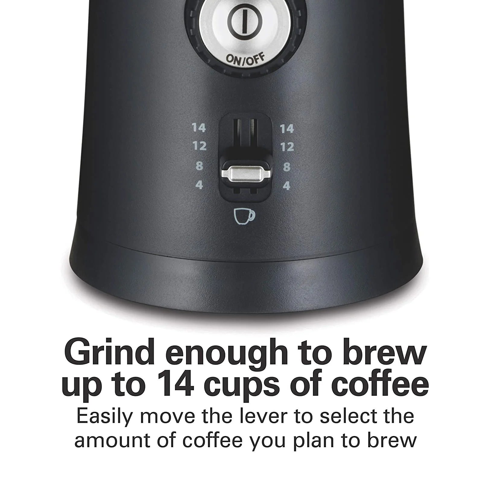 The Hamilton Beach® Custom Grind™ Coffee Grinder lets you conveniently grind coffee hands-free, making it easy to enjoy the taste of freshly ground coffee every morning. Just press the button once, and when the grinding is complete, the coffee grinder shuts off automatically. Whether you like your coffee finely or coarsely ground, simply turn the adjustable knob to choose your setting. Select from 5 settings, from coarse to medium to fine. Whether you're grinding coffee for a quick cup or a full pot, we've got you covered with easy-to-select cup settings. Just move the lever up or down to select the number of cups you plan to brew. Choose 4 to 14 cups.