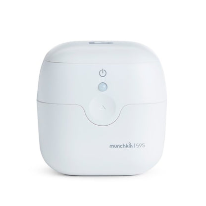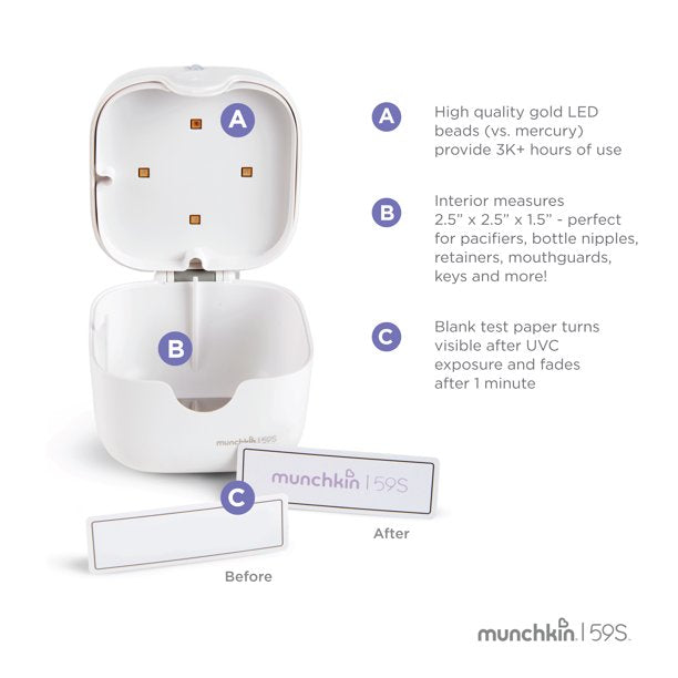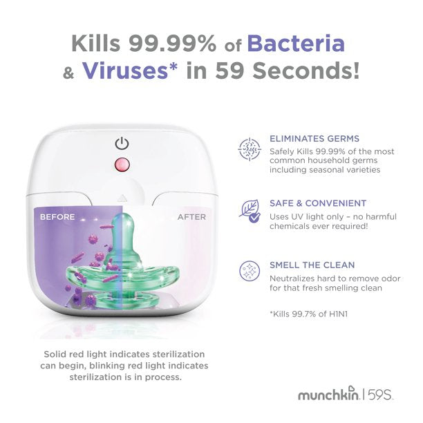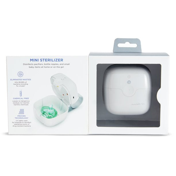 Babies drop things in dirty places at the worst times. This portable UV-C Sterilizer sanitizes pacifiers, bottle nipples, and more in under a minute so you can be on your way anywhere. This compact sterilizer safely eliminates over 99% of bacteria and viruses such as e. Coli, Salmonella, and Influenza (flu) using just UV light and has been tested by independent labs. No chemicals, heat, or water needed! The Mini Sterilizer's 4 Long-Lasting Gold LED beads are mercury and ozone free and auto shuts-off when the lid is opened. UV light is a safe and proven method of killing bacteria that is used by hospitals to sanitize everything from operating rooms to surgical equipment. You can trust the Mini Sterilizer to help keep your baby safe, healthy, and satisfied anywhere in seconds!