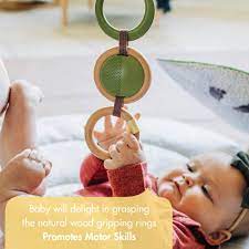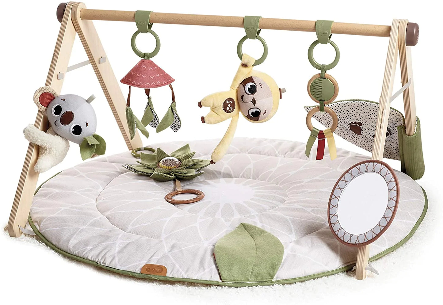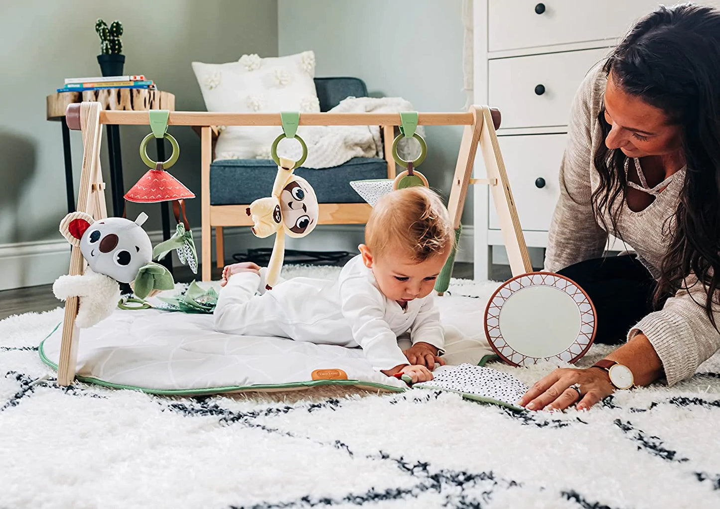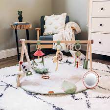 This fun and modern gym supports all baby development skills, includes 20 creative activities. It is soft with double padding and is made with top quality fabrics. Combine with a natural wood play arch equipped with a selection of cute hanging toys: a musical sloth doll, a fun natural wood trio, a giant leaf kicker, a crinkled eucalyptus mobile and an exclusive koala. It also includes activities that extend tummy time, such as: a multi-textured crunchy plant, a mirror, and a peekaboo leaf with satin ribbons. The modern design and unique color palette will complement your home décor and create a calm, balanced environment that encourages exploration. Includes a set of monthly milestone cards, They offer a wonderful way to create beautiful memories that celebrate the growth of your baby. Flip the card over and you’ll discover a helpful tip to help you learn more about your baby’s development at this stage. Recommended use from 0-36 months.