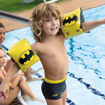 Zoggs Batman Armbands are the perfect learn to swim aid, designed for children aged 1-6 years. These two-tone armbands feature a Batman motif and are made from durable Vylux for safety. These armbands also feature dual air chambers and Easy Inflate valves for ease when inflating and deflating. The adjustable buoyancy means that as the child's confidence grows you can reduce the level of buoyancy slightly and encourage them to swim more on their own. Features: Designed for children aged 1-6 years (up to 25kg) Can be put on with ease even when inflated Made from heavy duty Vylux Dual air chambers for safety Easy Inflate valves allow for 50% quicker inflation and deflation Flat contoured under arm gusset for comfort An ideal buoyancy aid for learning to swim