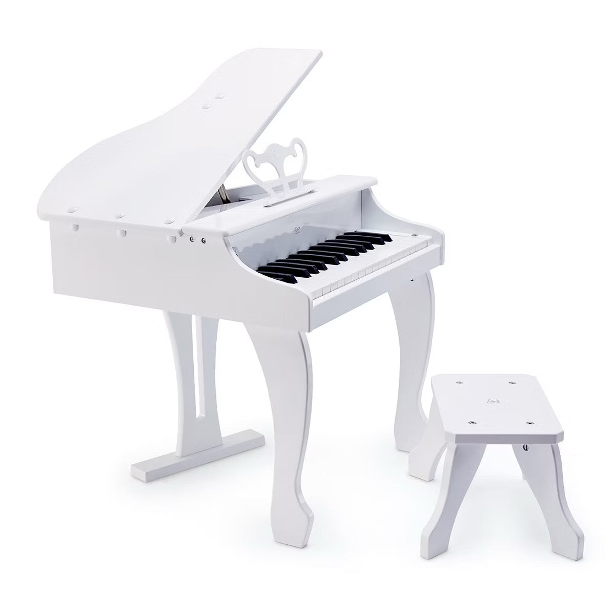 HAPE DELUXE WHITE GRAND PIANO THIRTY KEY PIANO TOY - The Deluxe Grand Piano is a real 30 key electronic piano that will enable your child to explore the wonder of music and create their own mini-symphonies. The Deluxe Grand Piano comes complete with realistic, miniature piano (including 30 keys, 18 white and 12 black) with three legs, one stool, one music rest, an on/off button, and a solid safety support frame for the piano’s lid. Includes a musical scale to help children learn the piano’s notes and scales as well as a handy music book. Features a realistic tone that has been created in close corporation with musicians and piano teachers that is very close to that of a full-sized piano and does not need tuning. Power saving mode automatically activates if left inactive for more than two minutes. The Deluxe Grand Piano lid’s solid support and safety frame is specially designed to stop in any position, which avoids any potential for injury or mishap. Item Weight: 19.5 lbs, Product Dimensions (L x W x H): 19.7 x 20.5 x 23.6 inches. 4 AA batteries required (not included).