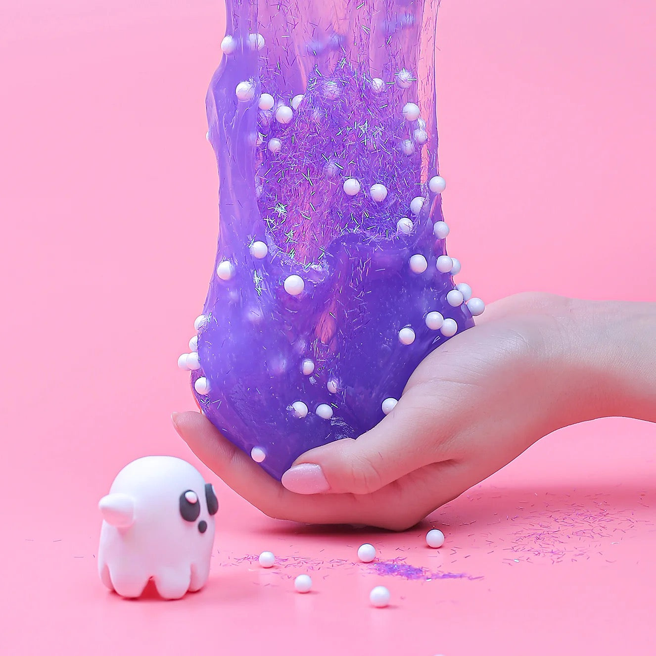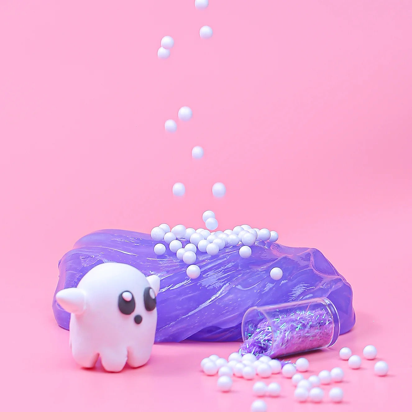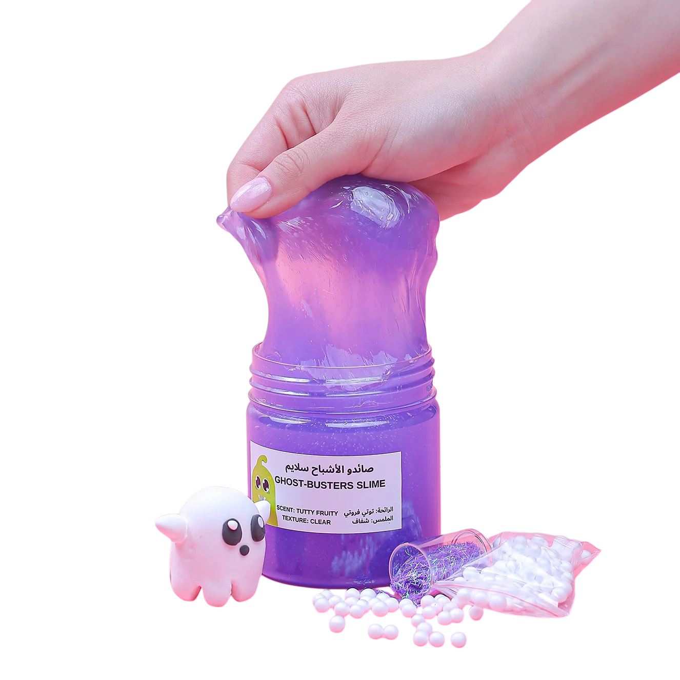 The Type: Clear The Scent : Tutty fruity Decorations: Ghost clay, white foam balls and purple hairy glitter. The slime size in the picture is 250 ml.