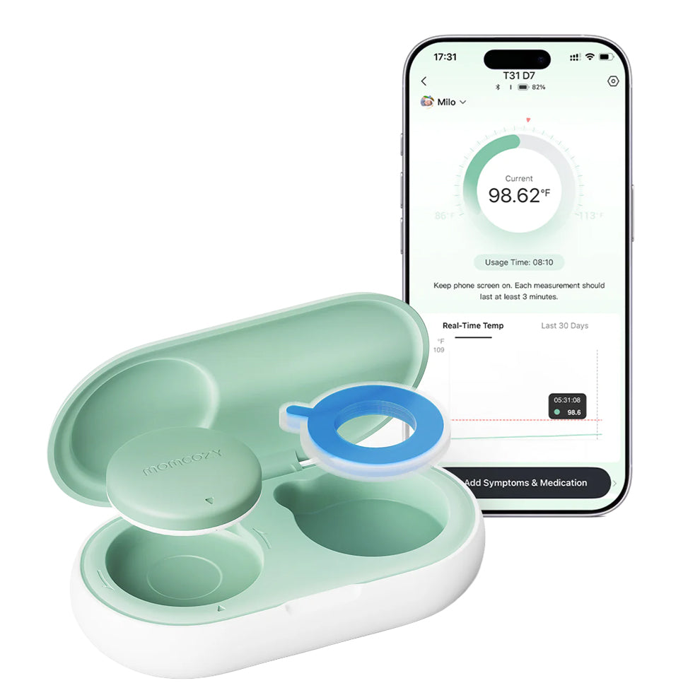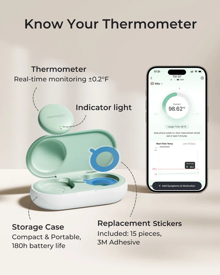 مومكوزي - ميزان حرارة ذكي للأطفال يُرتدى على الجسم | دقة طبية ومراقبة فورية عبر التطبيق