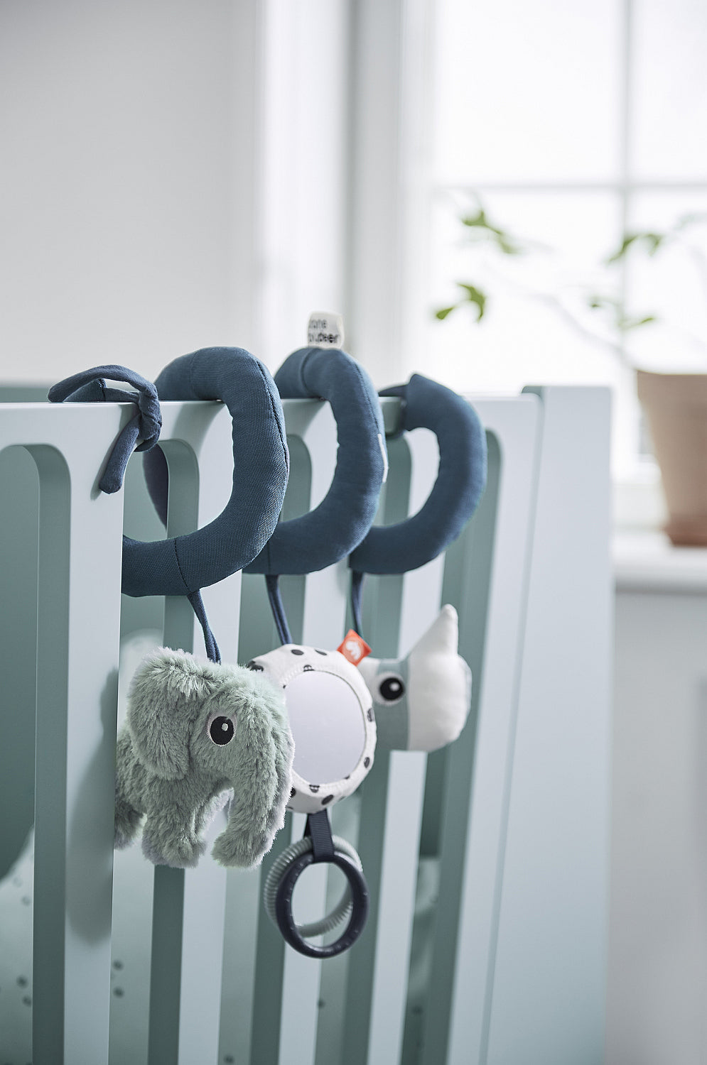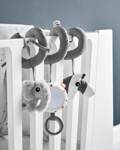 The flexible activity spiral can be fastened to the cot, car seat, pram or even mummy's arm. A perfect on-the-go entertainment.