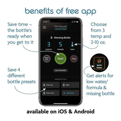Designed for busy parents, it connects to the Baby Brezza App (iOS & Android), allowing you to make a bottle remotely and get alerts when the bottle is ready, or when water or formula is running low. The airtight formula container keeps formula fresh, while the removable 1.5 L water tank is easy to refill and dishwasher-safe for simple cleaning.