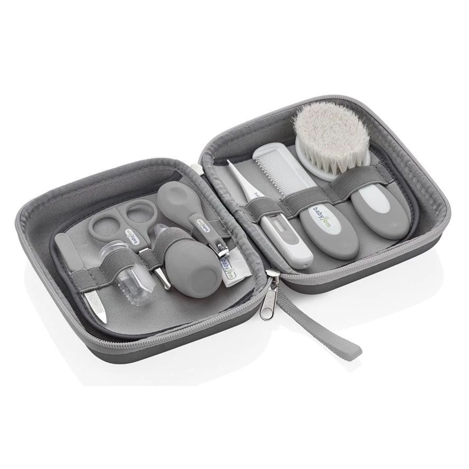 Babyjem Baby Care Set includes a baby brush, comb, digital thermometer, baby nail scissors, nasal aspirator, scissors, 3 nail files, baby toothbrush, and baby care bag.