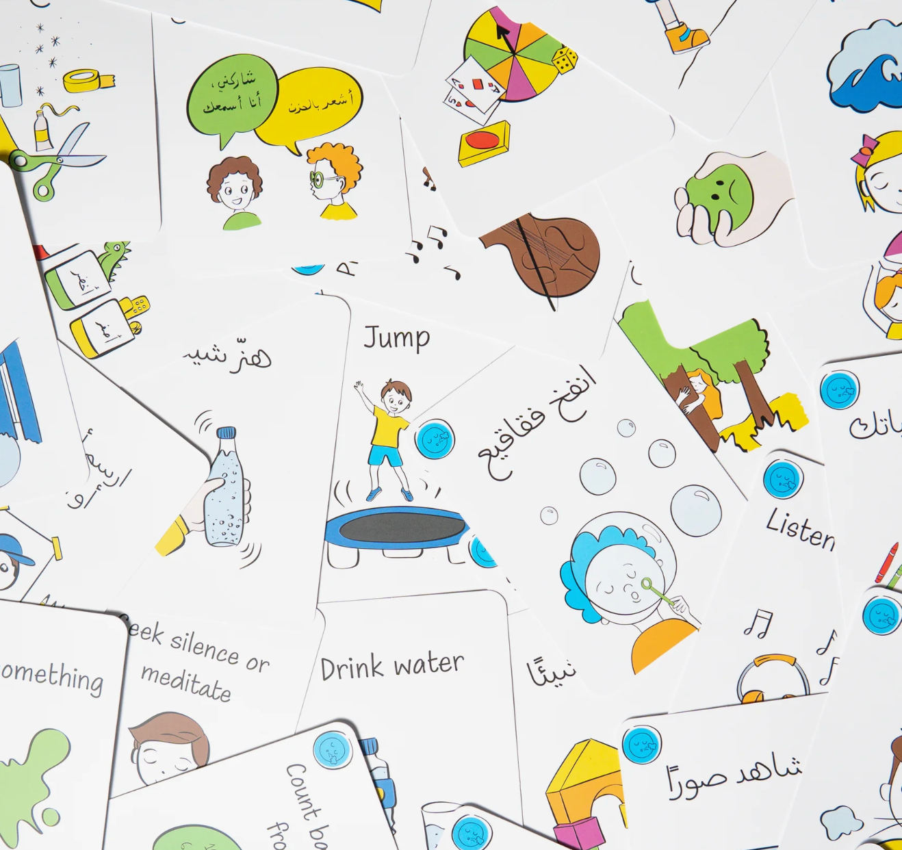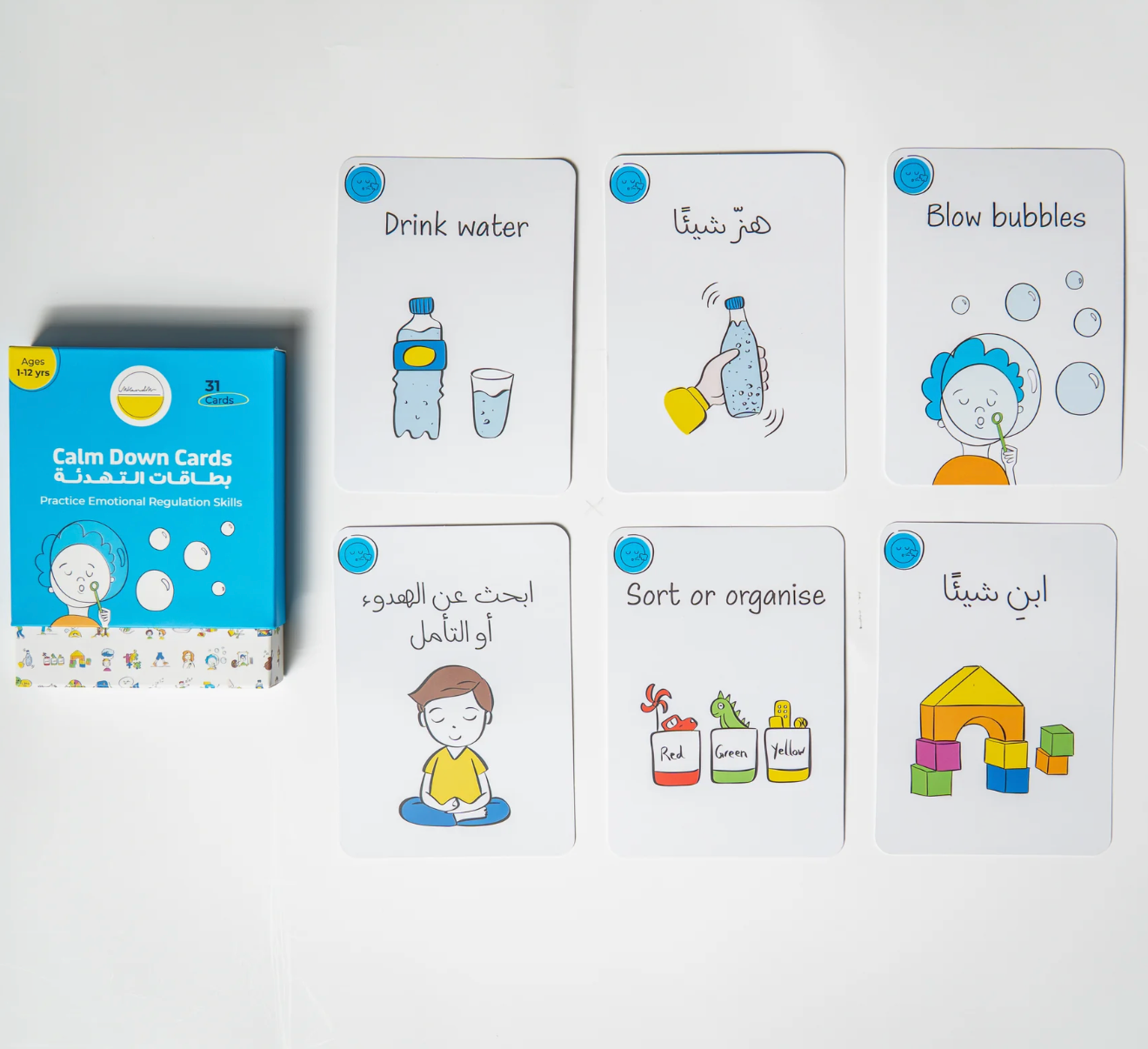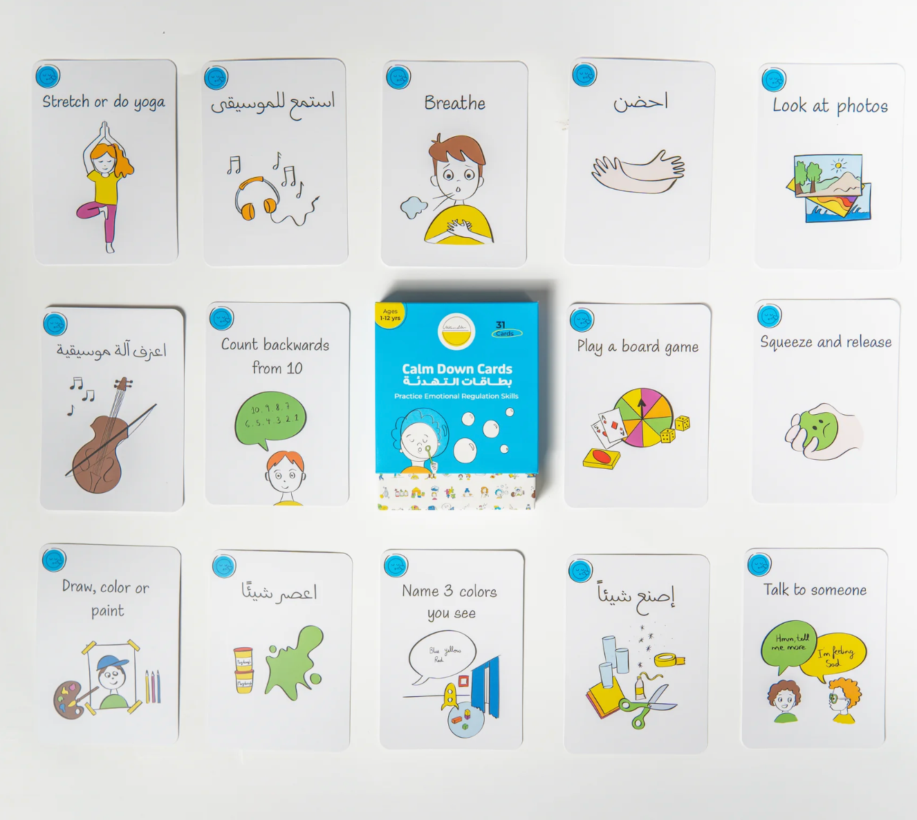 مجموعة مكوّنة من 31 بطاقة تهدئة تساعدك على تعليم طفلك مهارات التأقلم الممكنة وطرق تنظيم المشاعر.
