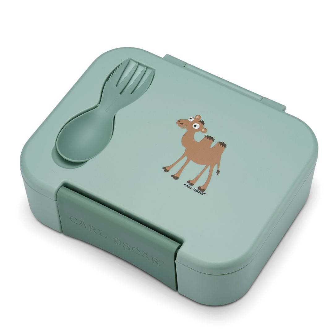 Fine Carl Oscar lunchbox in green with a print of a camel on the lid.
