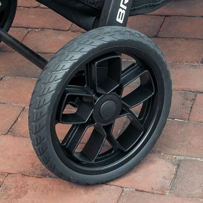 The Bravo® Primo Stroller showcases large wheels with foam-filled, treaded rubber tires and all-wheel suspension to navigate uneven terrain. The rear-linked foot brake secures the stroller with a simple tap and the multi-position, premium leatherette push handle adjusts in height for parent comfort.