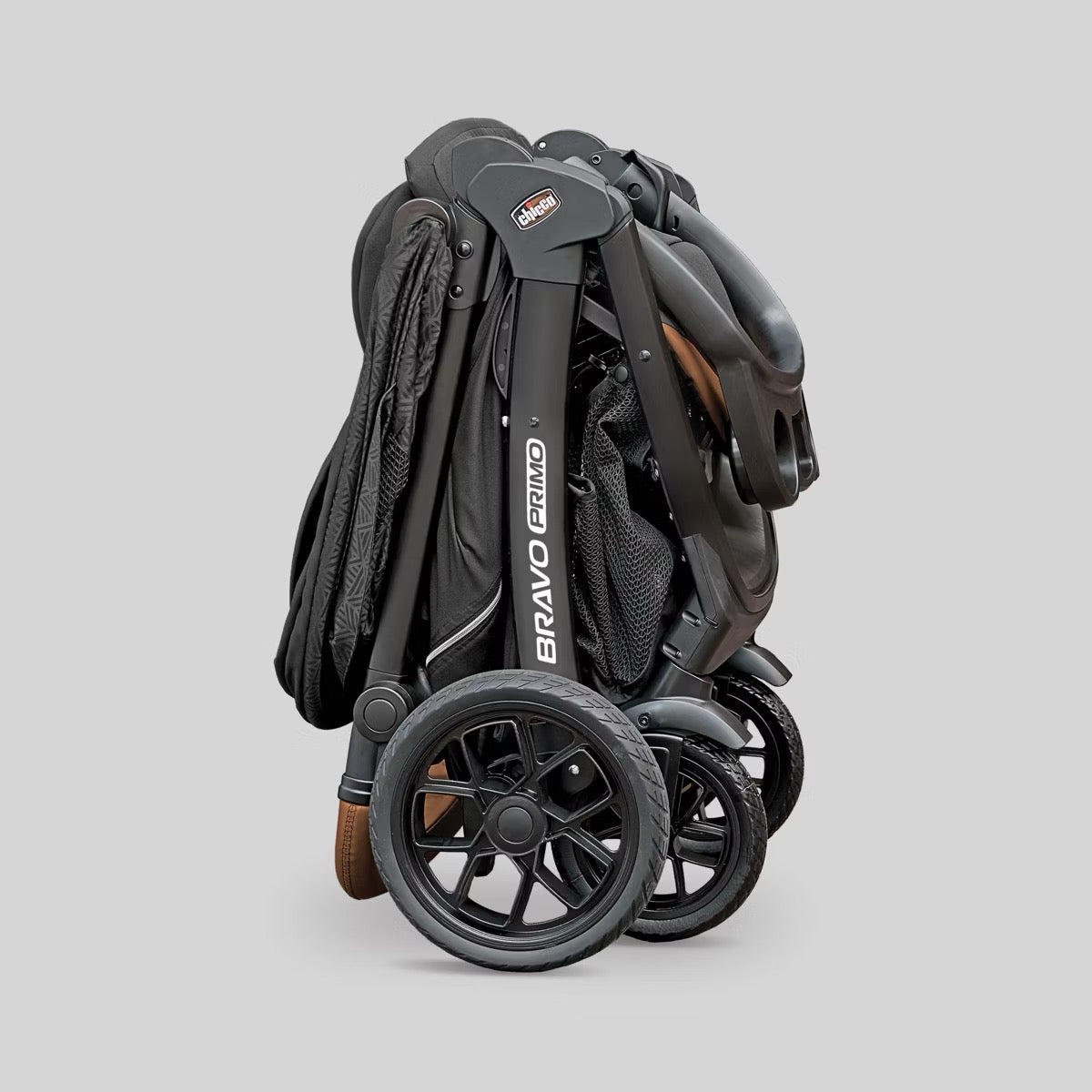 For additional parent convenience, the Bravo® Primo folds compactly with the child tray and stands independently without the push handle touching the ground. The large storage basket features 2 organizer pockets, mesh sides for visibility and easy front & rear access.
