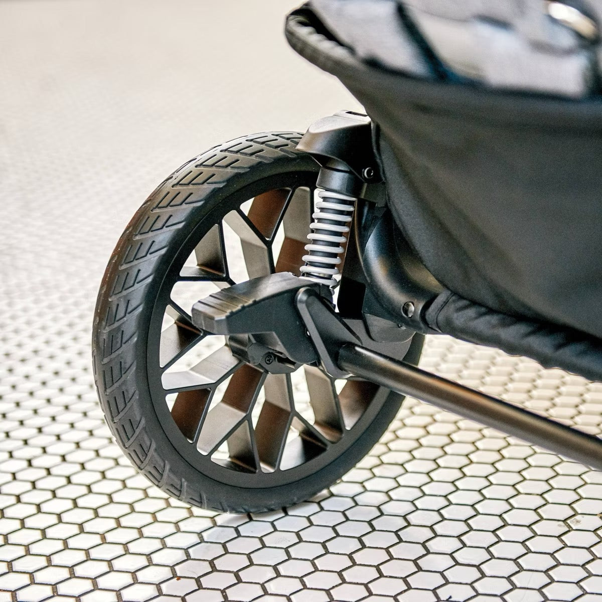 Bumpy city sidewalks and uneven terrain pose no problem for the Corso™ LE Stroller thanks to features such as FlexCore® adjustable rear suspension and large wheels with foam filled rubber tires. Corso’s one-hand, quick fold design is compact and stands independently without the push handle touching the ground, so you can easily fold it and keep it clean while on the go.