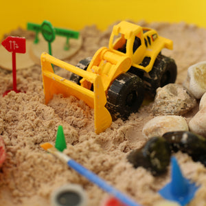 Contents: 600g Moon dough sand, combination of rocks, loader truck, road signs, tree wood pieces, colors and brush