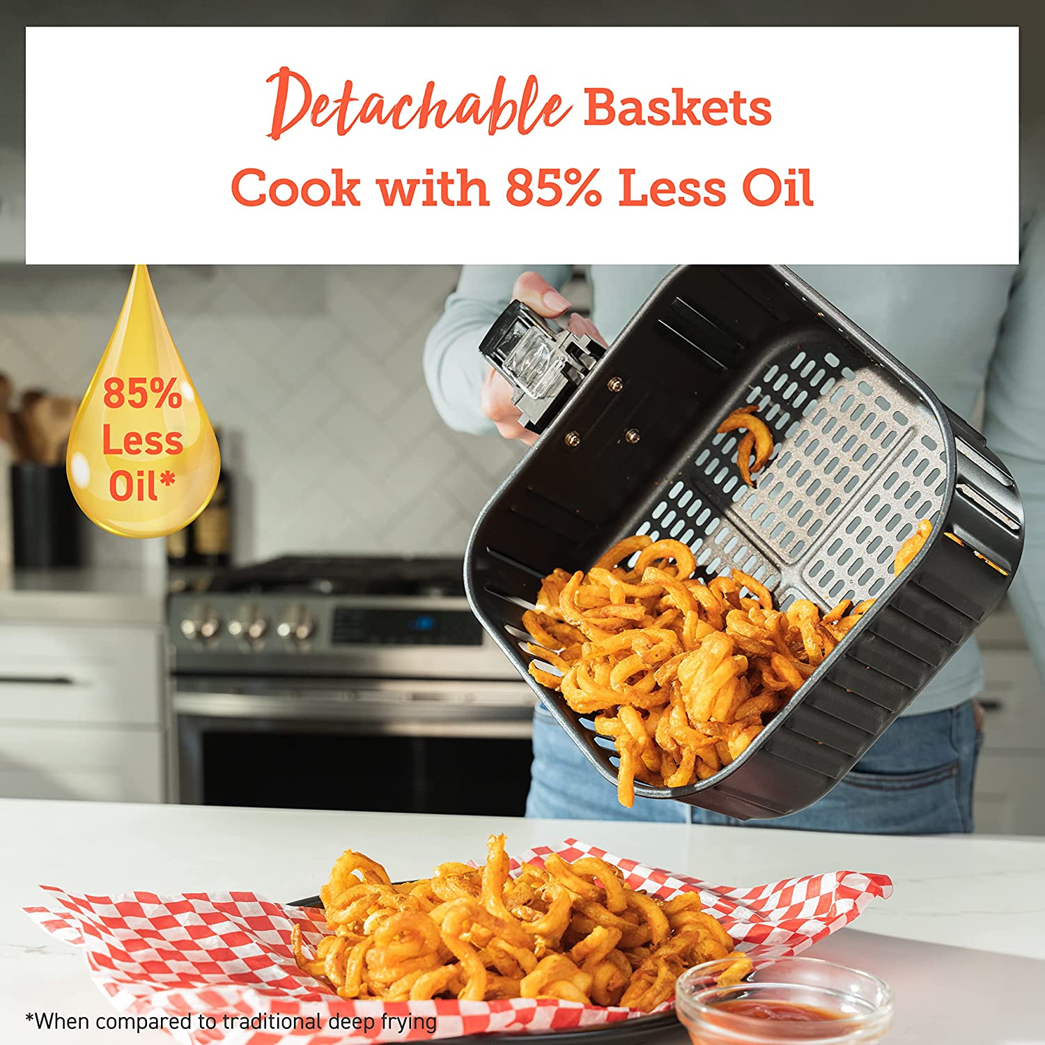 Less Fat: 85% less fat than traditional deep fried foods, same delicious taste.