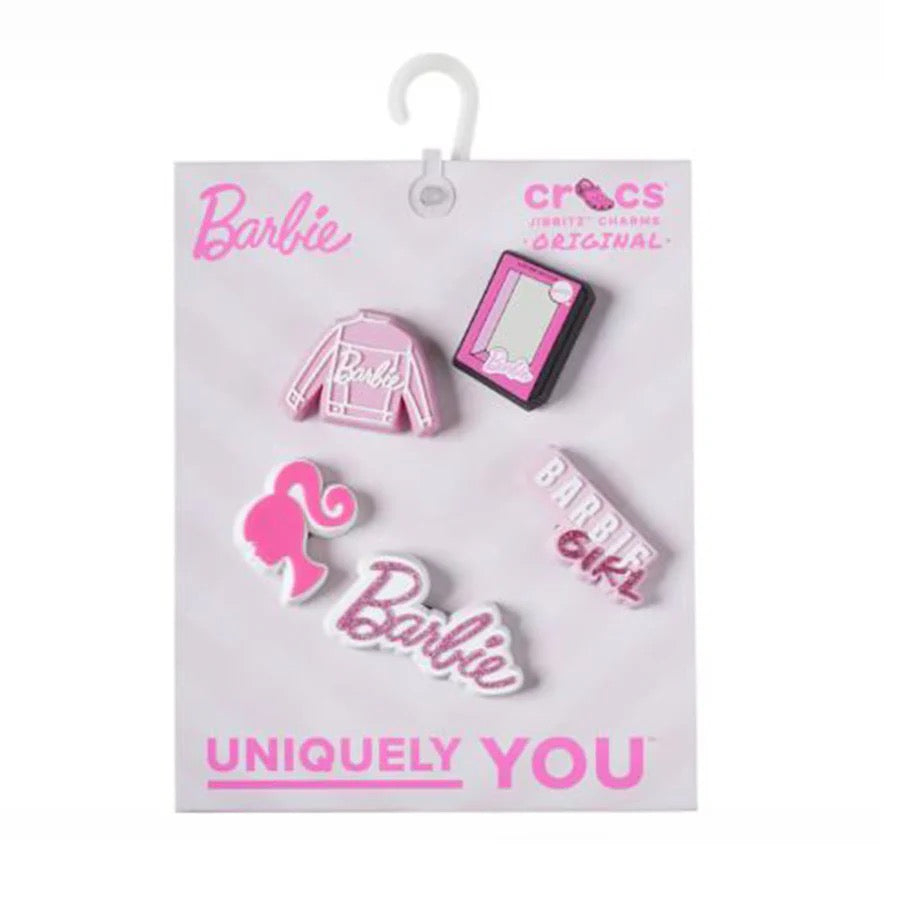Pop some personality into your shoes with these Barbie 5 Pack Jibbitz™ charms. They’re the perfect addition to your favorite pairs of clogs, slides, and more.
