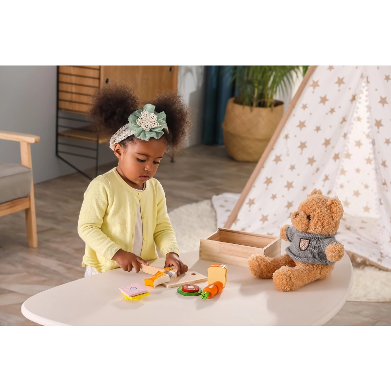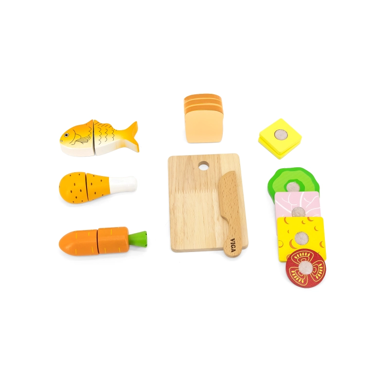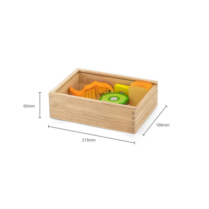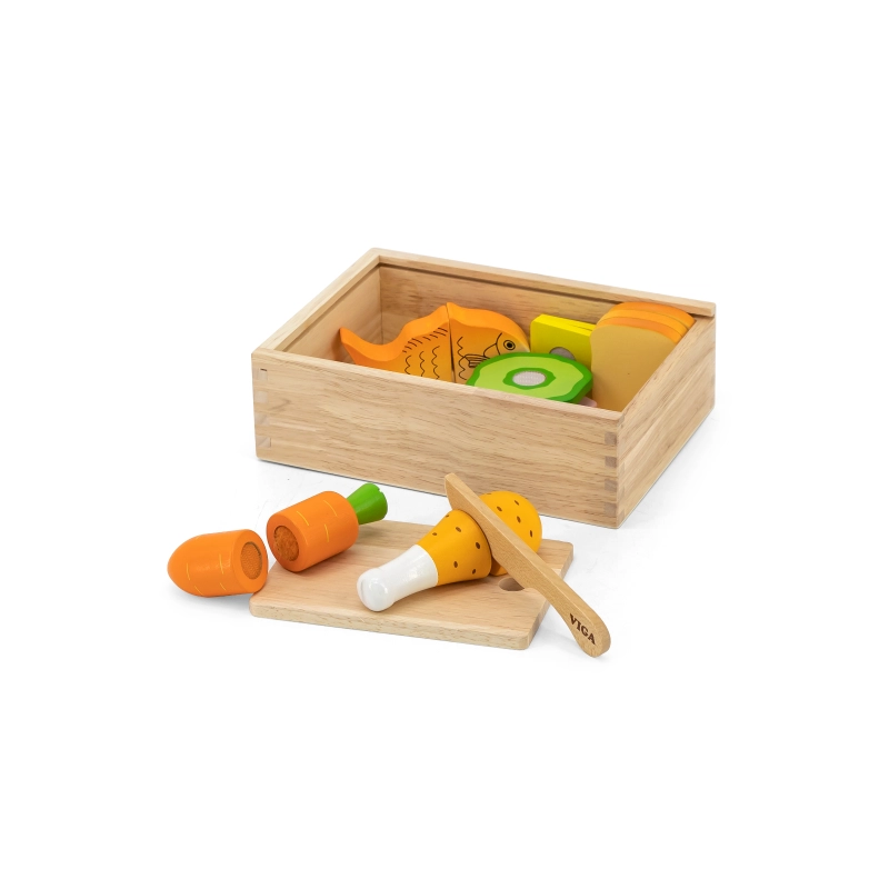 -Includes: Various food, wooden cutting board, safe knife, and wooden box with an acrylic sliding lid.