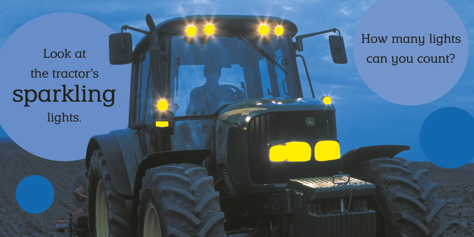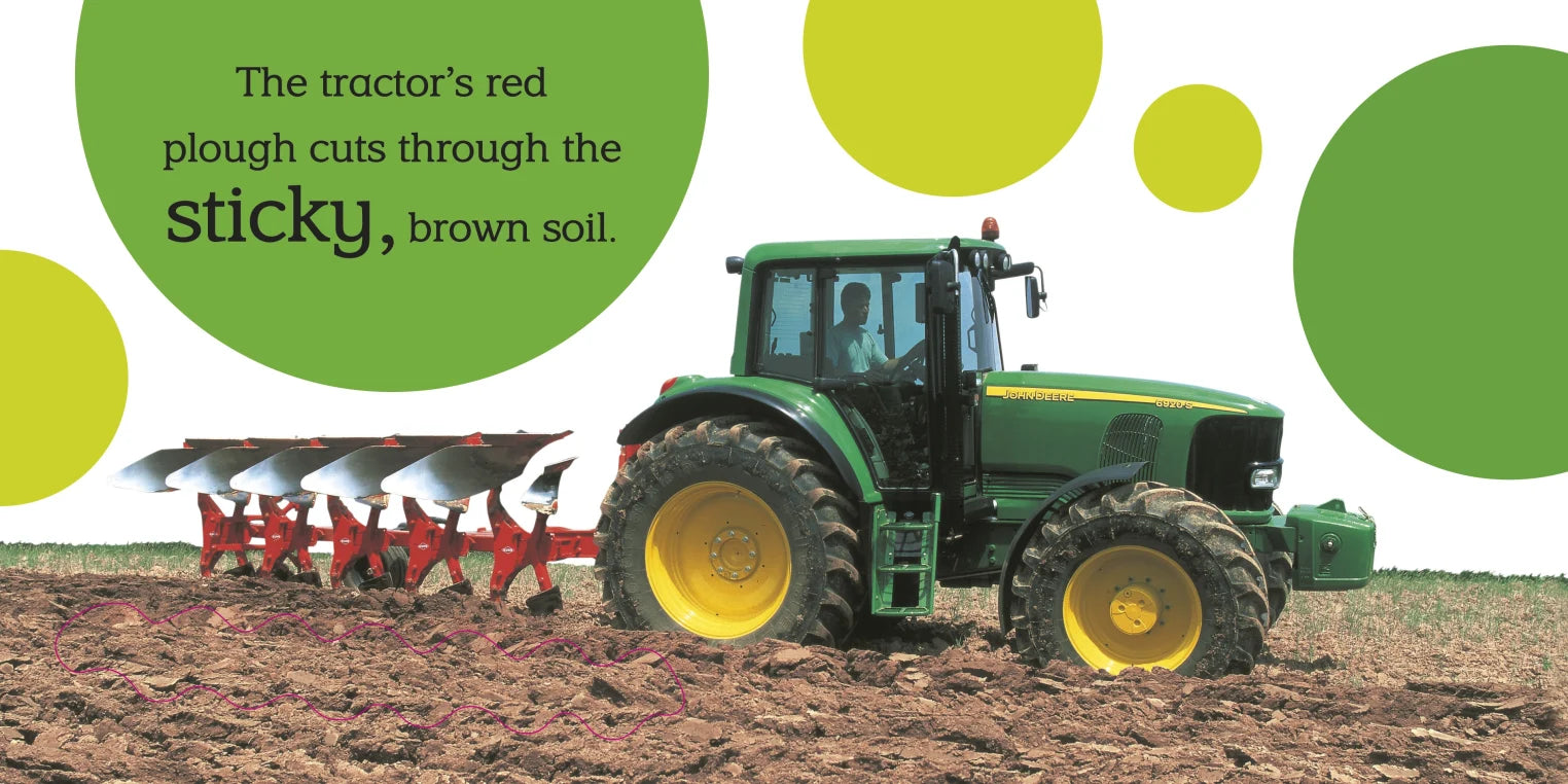 Bumpy, sandy, hard, soft and shiny textures in a chunky package will help your child discover all about tractors. Chug, Chug! Let their little hands roam and feel the smooth tractor bonnet, the spiky straw and how bumpy the tyres feel. Read it together - they'll learn as you play.