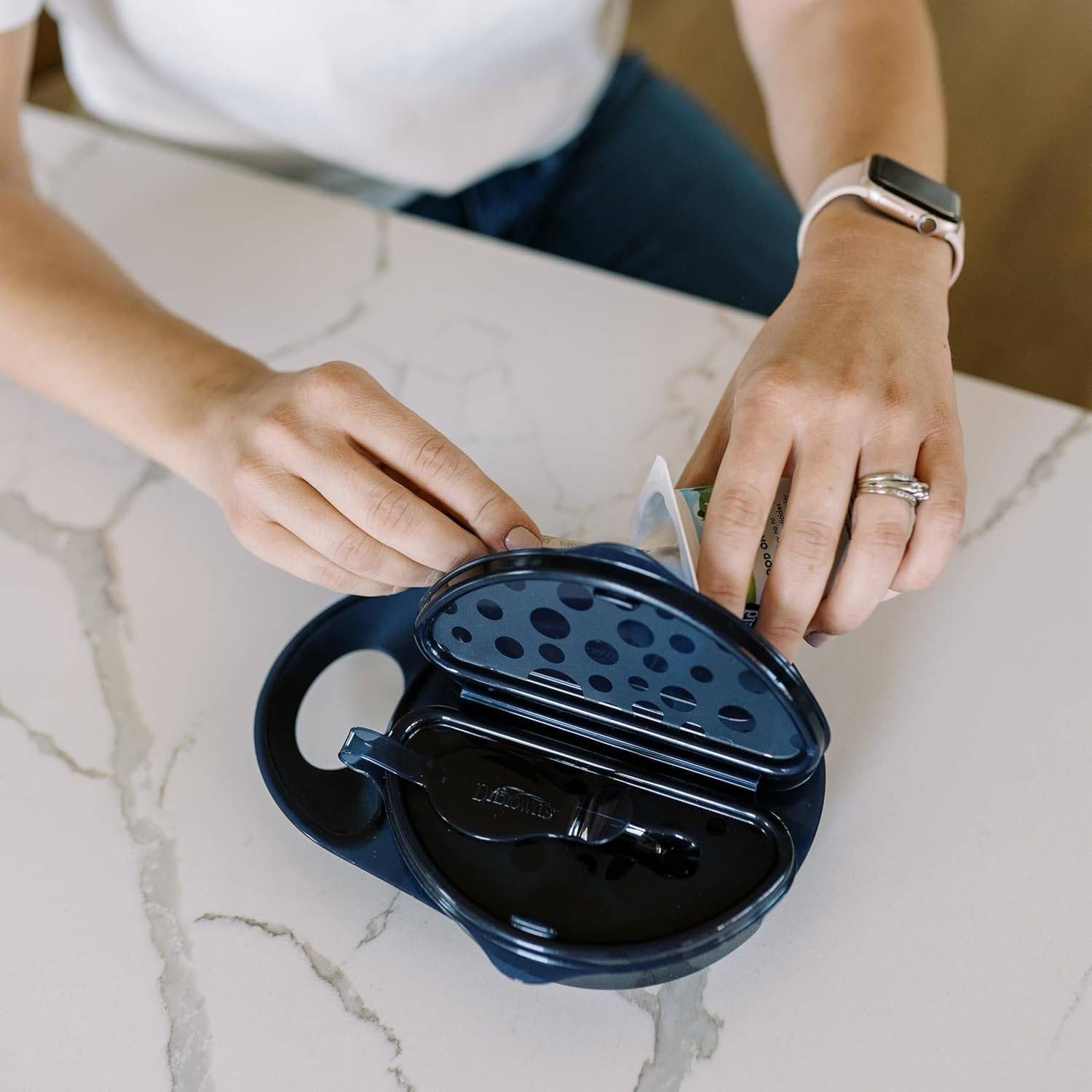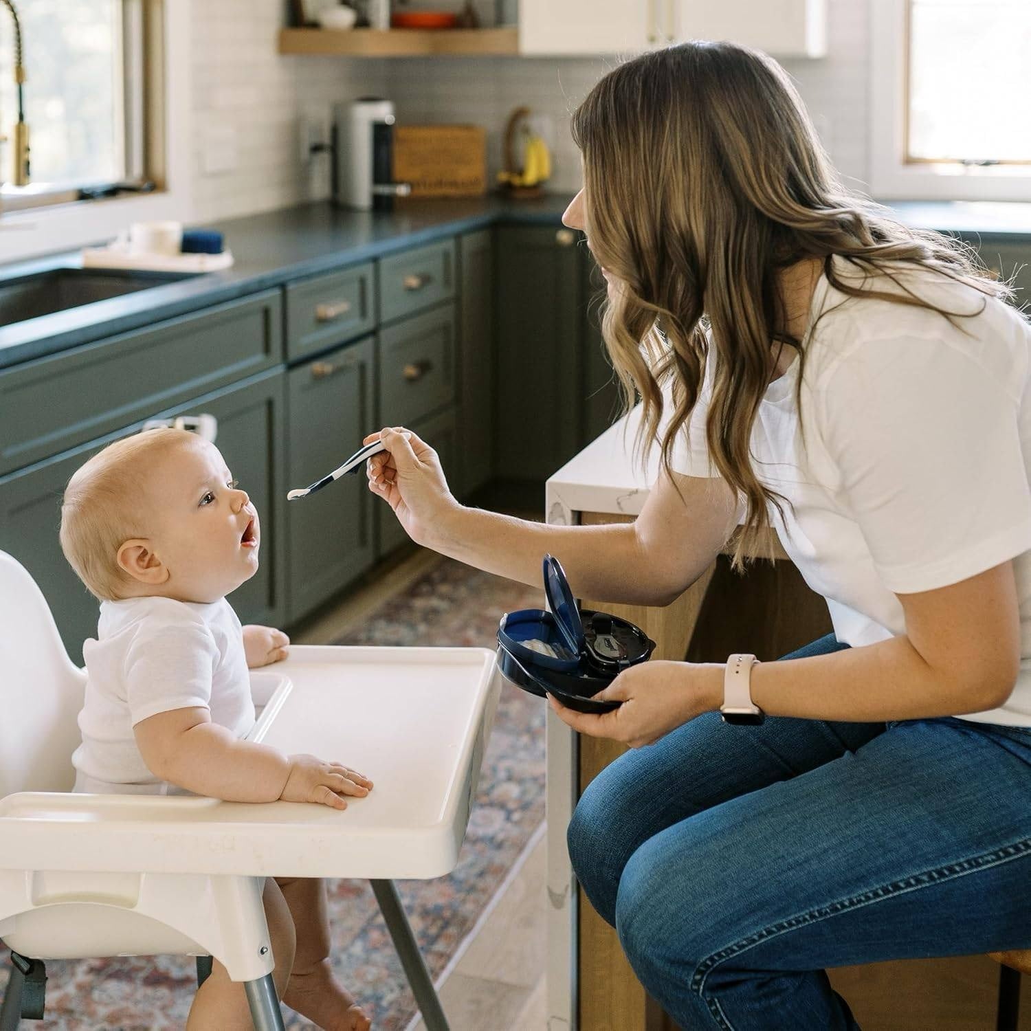 - Spoon snaps onto the bowl keeping it clean and in place