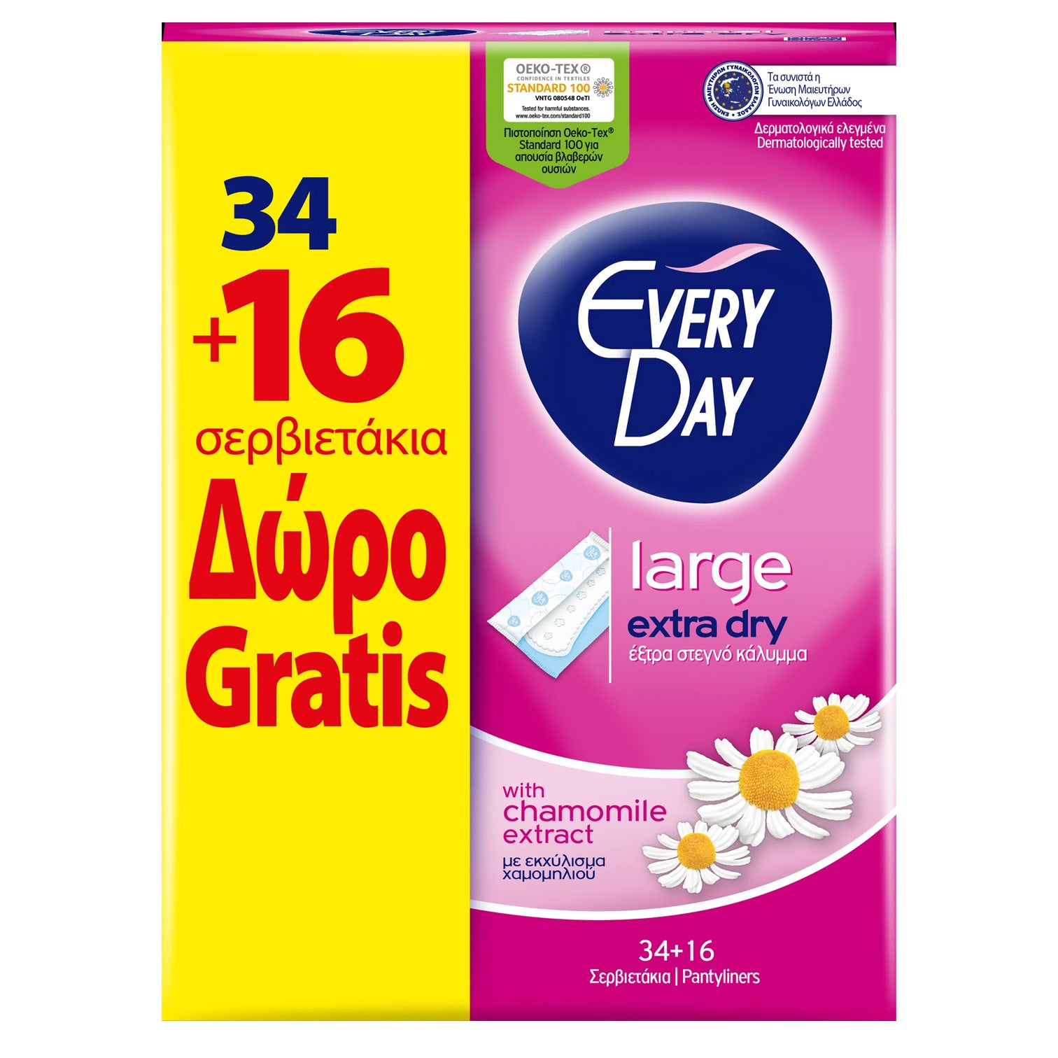 EveryDay Extra Dry Large Anatomically shaped pantyliners of large size. With extra absorbent top sheet for every day comfort and a safe protection. Enriched with chamomile extracts. Recommended by the Greek Union of Gynaecologists and Obstetricians. Certified by Oeko-Tex @ Standard 100 for absence of harmful substances. Individually wrapped.