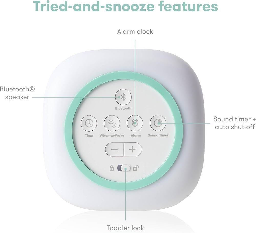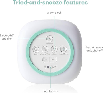 • SOUND MACHINE: Nursery essential with timer/auto shut-off (15, 30, 60 mins) and 7 sleepy sounds - white noise, pink noise, heartbeat, lullaby, bird, waves, and wind. Sounds coordinate with those on the Frida Baby Portable Sound Machine (sold separately). • WHEN-TO-WAKE CLOCK: Sleep trainer uses 3 simple colors and sounds to help toddlers know when it's okay to get out of bed - Red (Bedtime), Yellow (15 minutes before Wake Time), Green (Wake Time) • NIGHTLIGHT: Optional nightlight with 3 warm glow levels plus blackout mode to keep the room completely dark • ESSENTIAL FEATURES: Toddler lock prevents unwanted changes and backlit buttons save you from fumbling in the dark • BLUETOOTH® SPEAKER: Connect your phone to automatically set the clock's time and play your own sleep sounds • LIFETIME WARRANTY: We don't sleep on service, y'all. • INCLUDES: (1) 3-in-1 Sound Machine + When-to-Wake Clock + Nightlight