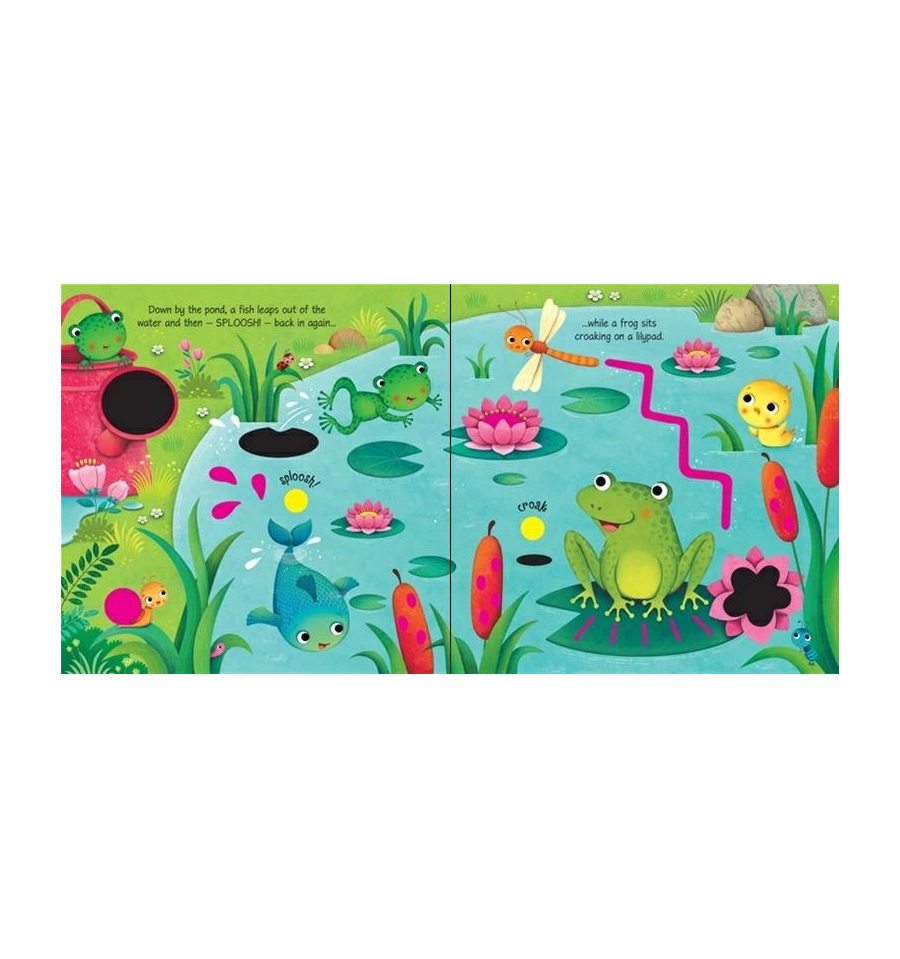 Little children can listen to a baby bird tweeting, frogs croaking in the pond and owls hooting when they press the pages of this delightful book. Colourful pages show the garden and pond in the sun and rain and at night. With simple text, holes to peep through and fingertrails to explore, this is a lovely first book about nature and the outdoors.