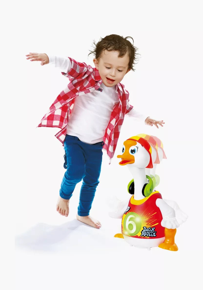 The interactive Hola Hip-hop Swing Goose by Hola can dance and rap! He swings his neck while dancing to the beat of Hip Hop music. The only way to stop him from his humorous dancing is to grab his neck but be gentle or he will protest loudly as he likes to dance to the beat!