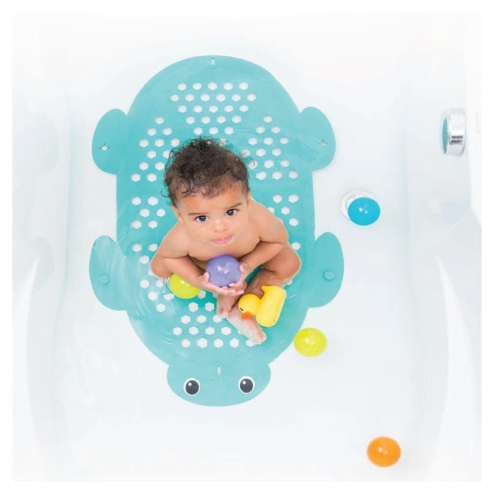 Multi-functional bath mat keeps little ones from slip-sliding in the tub. When playtime is done, fold up the bath mat to create a storage basket for drip-drying bath toys and keeping your tub tidy. Includes strong suction cup hook to hang on tub wall.