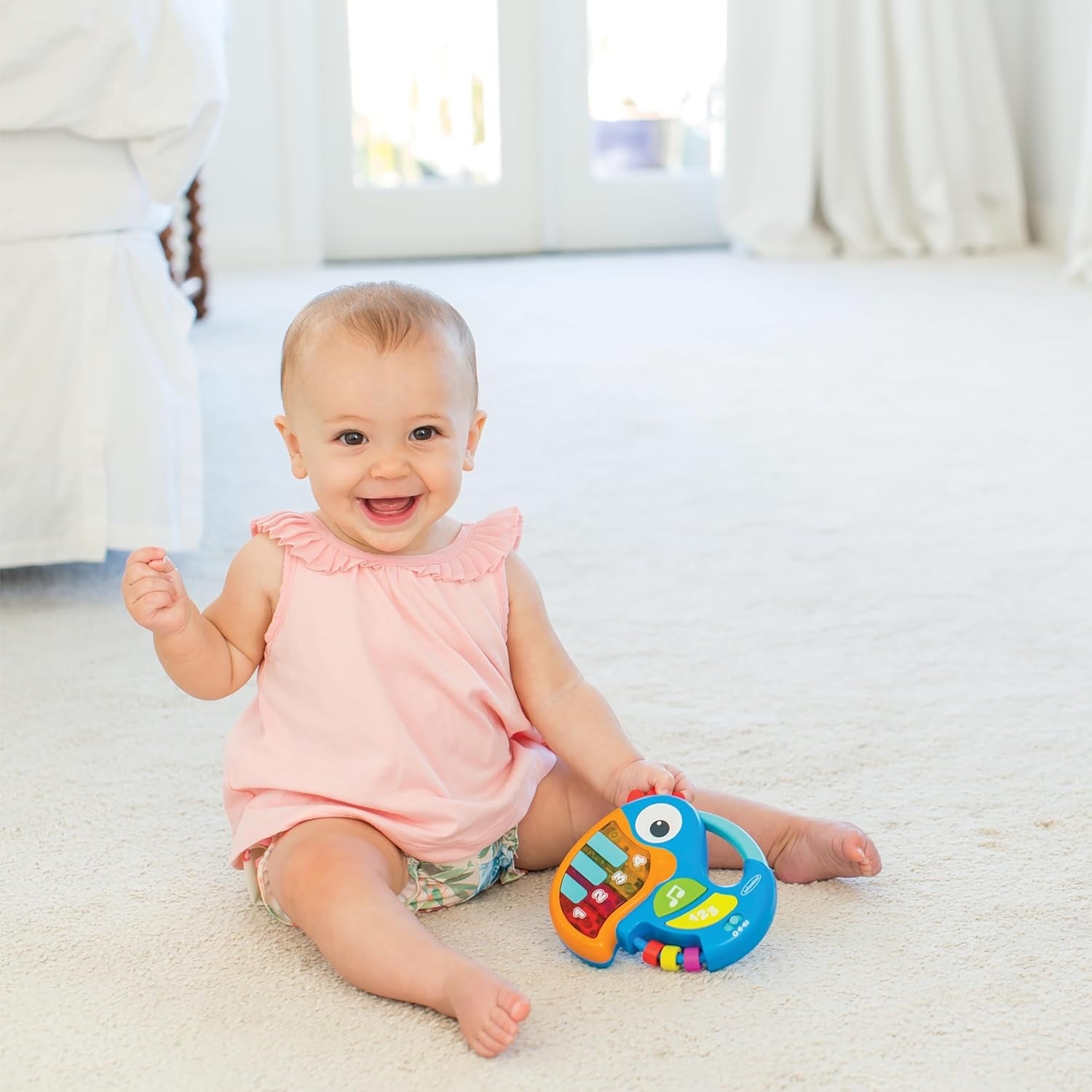 Discover musical learning with the Infantino Piano & Numbers Learning Toucan. This engaging toy features 9 delightful songs, 18 spoken words and phrases, and 13 entertaining sound effects to captivate your little one. The ergonomic tail handle is perfectly sized for small hands to grip and explore. As your child plays, they'll develop an understanding of music and numbers while discovering how their actions create sounds—building essential cause-and-effect learning skills in a fun, interactive way.