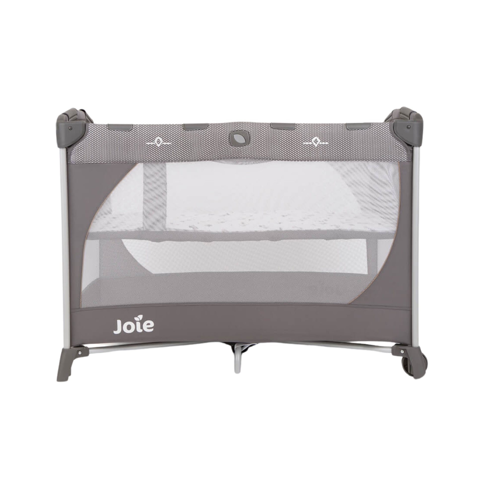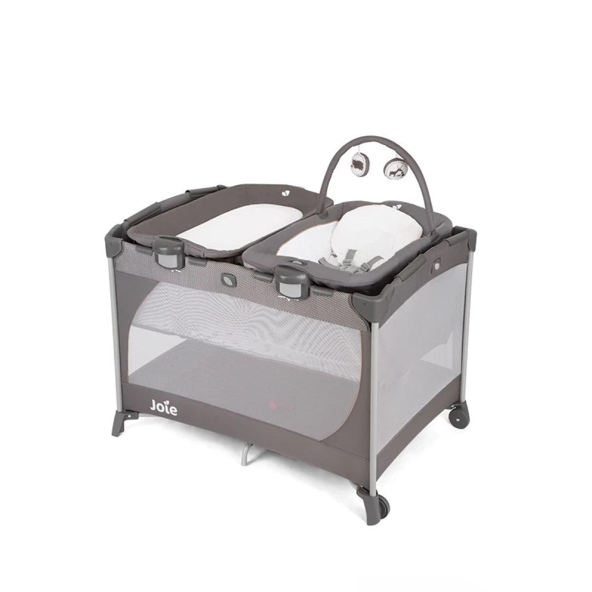The Joie Commuter Crib Playpen with Bouncer and Changer that can be used on or off the crib, Opens and folds in seconds, quickly and easily, and stores in the included cover, Bouncer with Relaxing Vibration with 2 speeds, Fabric of grid on all four sides for ventilation, two built-in wheels, Includes 2 soft toys for entertainment