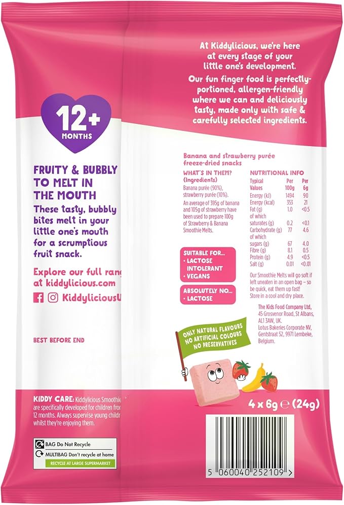 Our Strawberry and Banana Smoothie Melts are made of 100% pure fruit, which we whizz up and then set into tasty bubbly bites that melt as soon as you put them on your tongue. Perfect for snacking on-the-go.