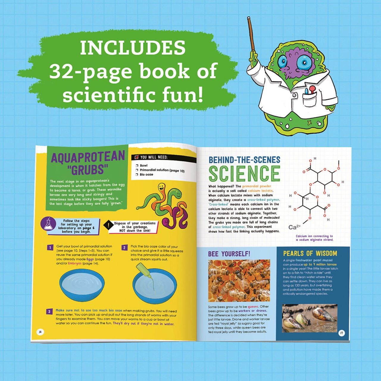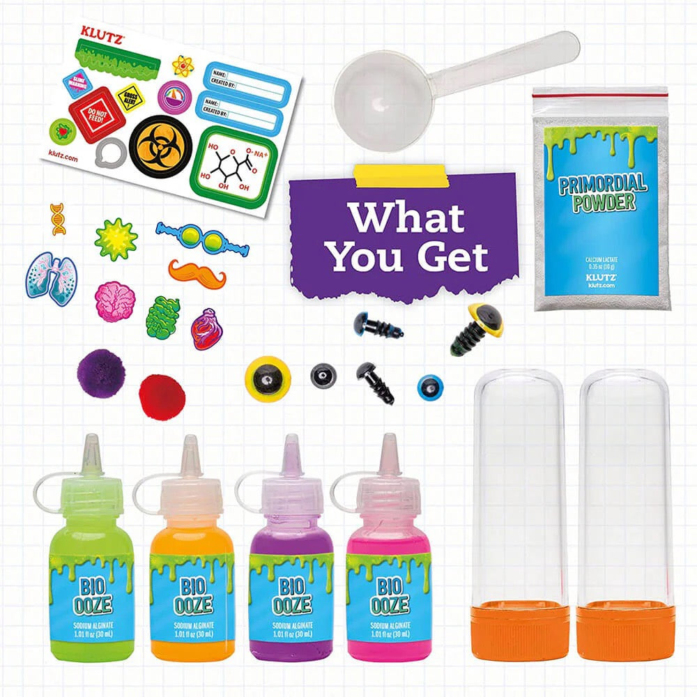 Create 6 custom gooey creatures in an aquatic terrarium. Pour neon gel that forms biopolymer blobs from the chemical reaction between sodium alginate and calcium chloride. 10 activities explore life cycles, adaptation, and traits that real animals use in the wild. Display your new friends in their very own specimen test tube habitat with custom stickers.