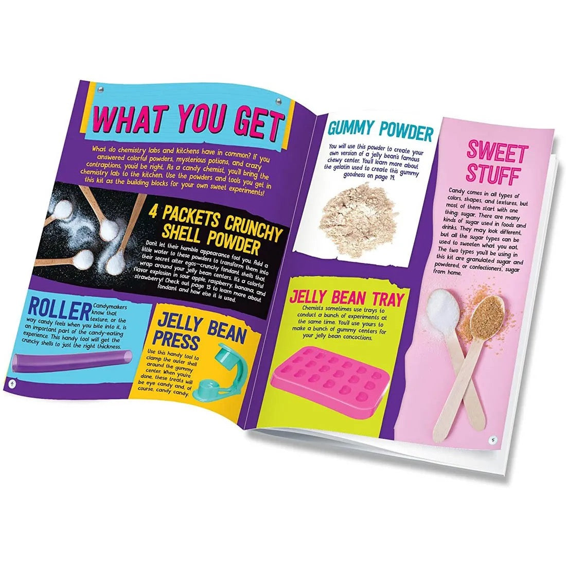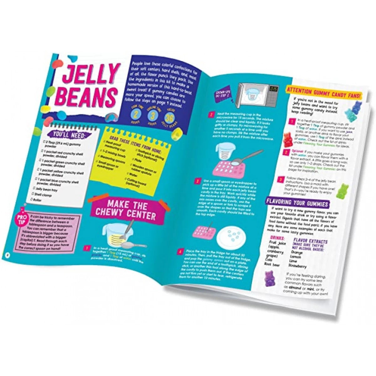 Turn your kitchen into a candy laboratory! Use The powders and molds in the kit to make 36 colorful Jelly beans in 4 awesome flavors. Then follow instructions using ingredients from home to make marshmallows, lollipops, Fudge, and more.