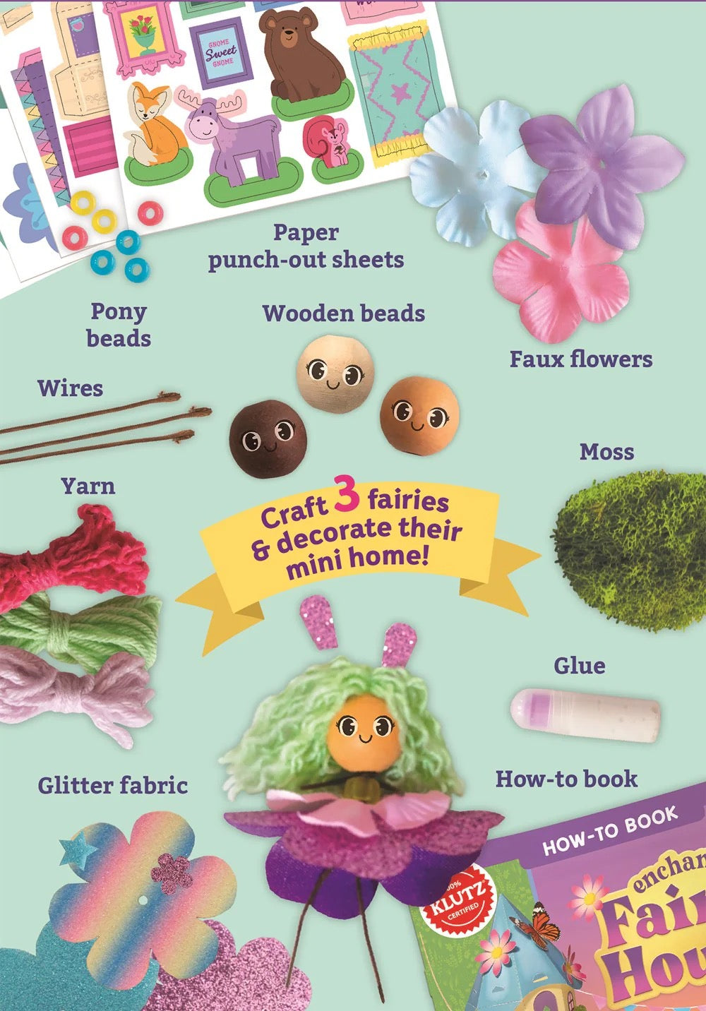 Make a little mini magic! Bring three whimsical fairy dolls to life. Mix and match colorful glitter skirts, wooden beads, flowing yarn hair, and faux flowers to design and dress the fairies with twisted wire and glue. Build their home and decorate it with teeny furniture, enchanted flowers, and faux moss. Finally, cut and bind an illustrated, fairy-sized storybook featuring your three fairies on a rhyming adventure.