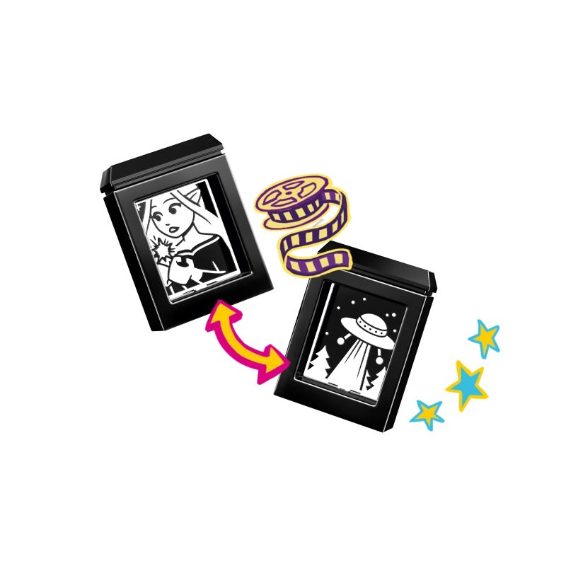 Movie night accessories include a light brick projector (battery included), 2 movie slide elements, buildable beanbag chairs, 2 drinks, a popcorn box, and a comic book.