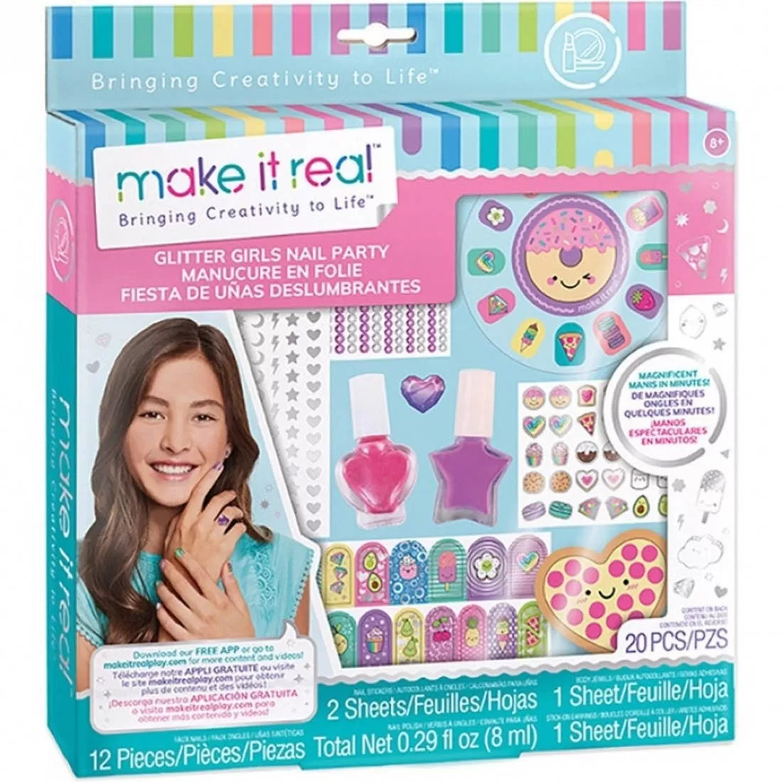 Get fashion nails in no time! The Glitter Girls Nail Party set includes: press-on faux nails, 2 colours of nail polish, 2 sheets of nail stickers, body jewel stickers, stick-on earrings, nail file, plastic ring, and instructions. In total there are 150 pcs in this fun set! Ages 8+