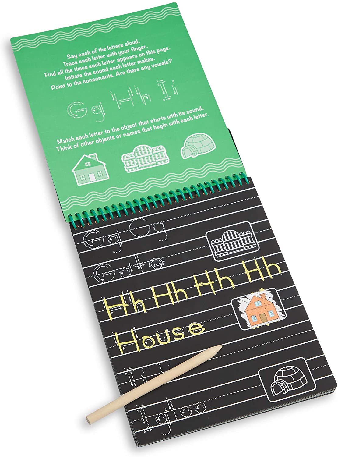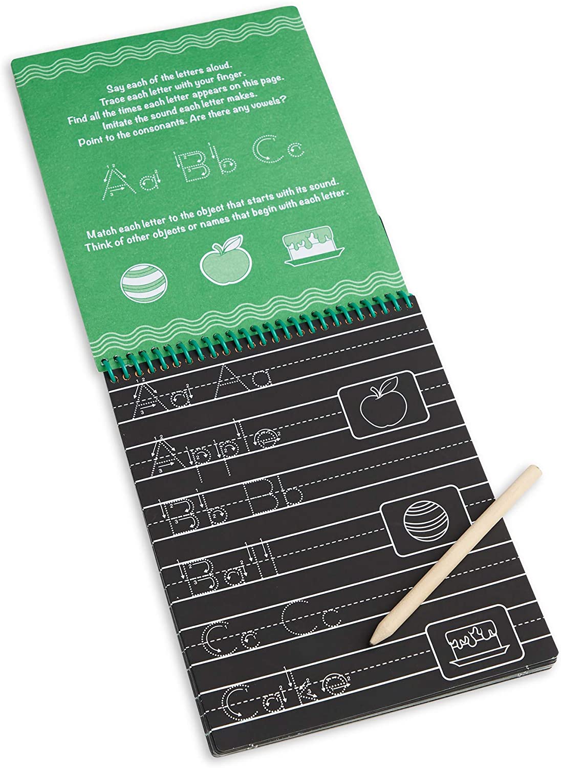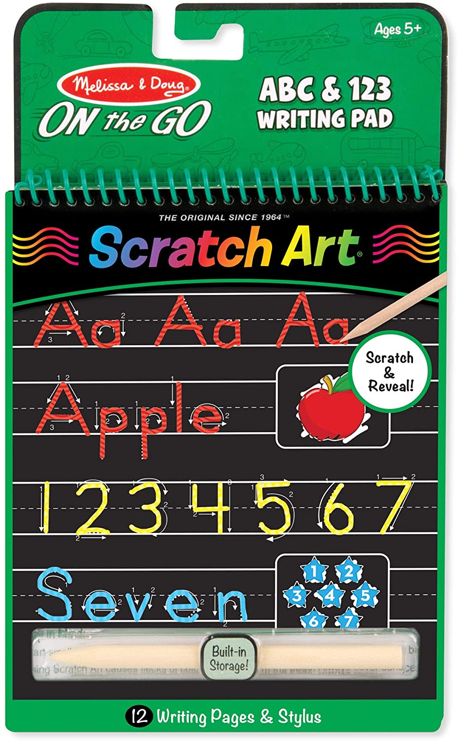 The Melissa & Doug Scratch Art ABC & 123 Writing Pad is a creative way to learn and practice the alphabet and numbers! Use the included wooden stylus to follow the arrows and scratch away the black coating while tracing and writing letters and numbers. Scratch more and reveal vibrant colors and matching pictures! The stylus stores in the cover of the 12-page spiral-bound pad.