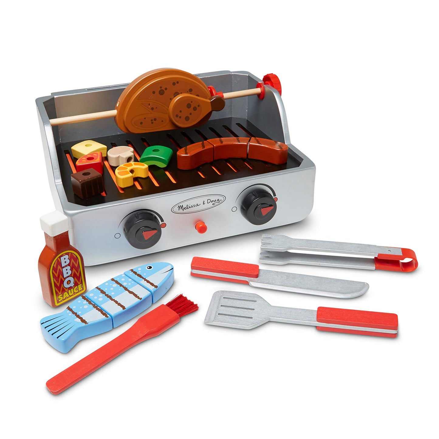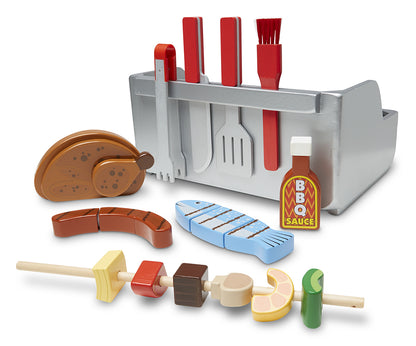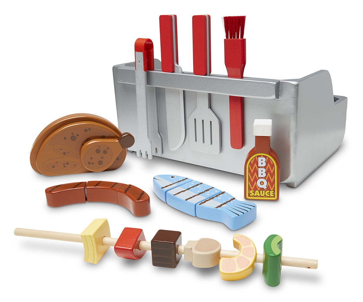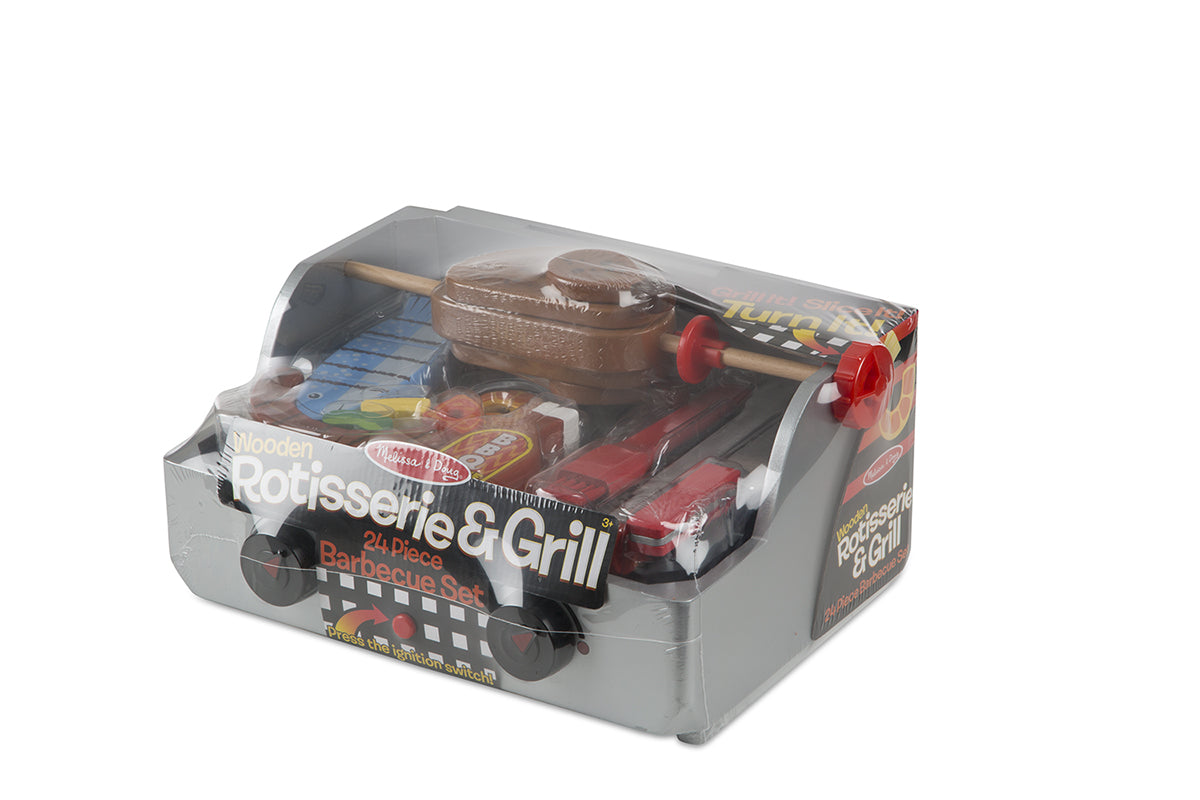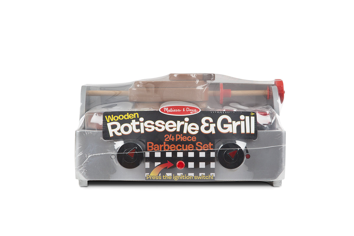 Grill it, slice it, and turn it! Cook up a fantastic feast with this deluxe wooden barbecue play set! The 24-piece set includes specialty grilling favorites like a whole rotisserie chicken that spins on a skewer, a whole fish, sausage, shrimp, and even vegetables for grilling kabobs. Use the kid-friendly wooden basting brush, spatula, tongs, and knife to prepare, flip, grab, and cut the food. This grill is easy to "fire up" with its ignition switch; adjust the temperature with the movable knobs on the barbecue, and turn the rotisserie so the food grills to perfection! The chicken, fish, and sausage pieces are held together with self-stick tabs; use the knife to slice them apart. After mealtime, use the grill as a handy storage place for all the items! The Wooden Rotisserie & Grill Barbecue Set encourages hand-eye coordination, fine motor skills, creative expression, and imaginative play.