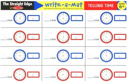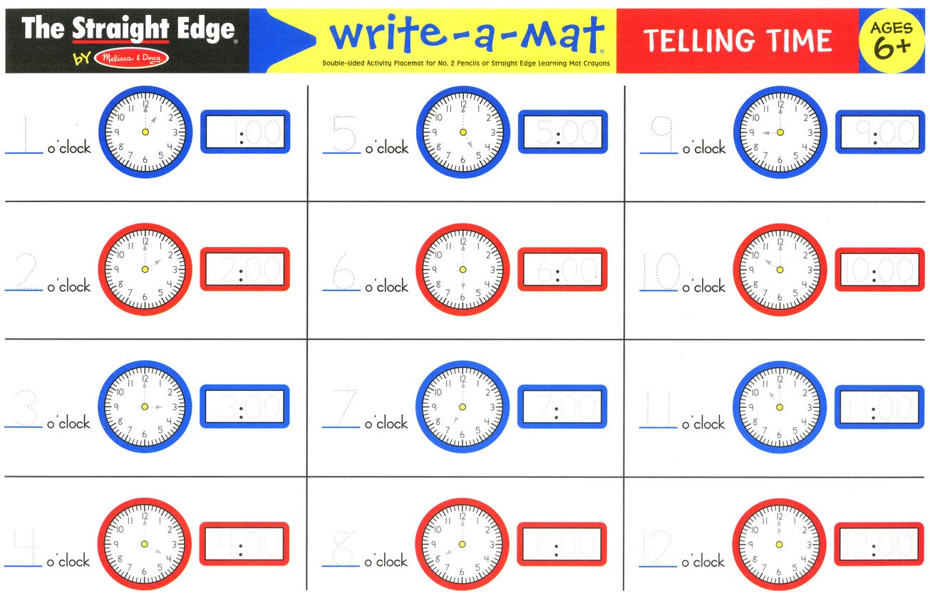 Turn practice, practice, practice into fun, fun, fun with these double-sided learning mats that reinforce three important skills in handwriting, phonics and telling time. The mats present visually guided techniques to master these educational building blocks with colorful graphics and five bright, wipe-off crayons.