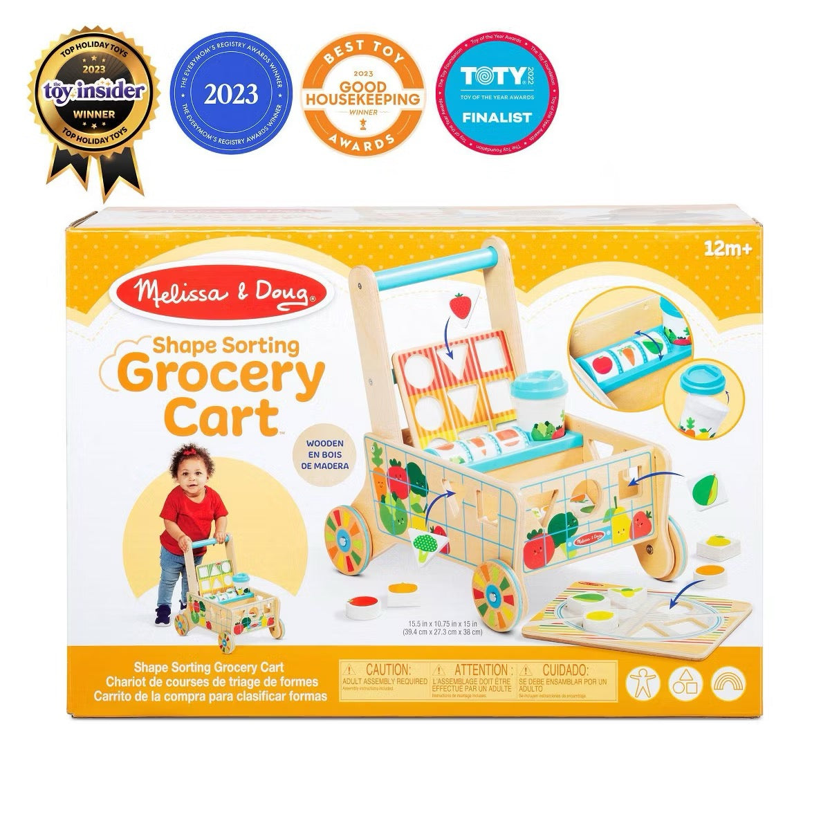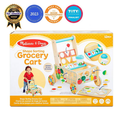 This cheery and sturdy wooden grocery cart is filled with fun skill-building activities! Very young kids can sort colorful chunky wooden food shapes through holes in the sides of the cart, and place them in two wooden puzzle boards that store in the cart. Spin the built-in roller drum for sensory stimulation and matching games, and enhance imitative pretend play with a realistic coffee cup with removable lid that fits in a cup holder in the cart! As kids grow, using the cart as a push toy helps build motor skills and inspire imaginative play. A great way to encourage kids 12 months and older to explore problem-solving and cause-and-effect. Assembled cart measures 15.5 inches tall, 10.75 inches wide, 15 inches long (39.4 cm x 27.3 cm x 38 cm). Melissa & Doug infant and toddler toys inspire “a-ha!” moments of discovery. Adorable, diverse characters and a variety of fun shapes and textures encourage exploratory, skill-building play.