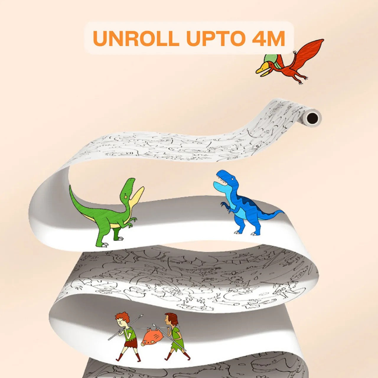 4 meters dinosaur themed adhesive colouring scroll, you can stick & peel with no marks left on the wall. On the wall, on the floor, on the desk, pick one comfortable posture to draw. Patterns are different in every inch. Heavyweight paper that no bleeding issues. Soybean ink printing, odorless & safe.