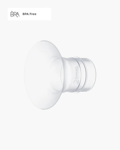 Flange sizes typically range from 13 to 36mm, depending on brand. This measurement refers to the beginning of the flange tunnel, not the flange opening. Momcozy breast pumps include a standard 24mm flange and offer additional 27mm flanges for moms with larger nipples. We also provide inserts ranging from 15mm to 21mm to accommodate a variety of nipple sizes.