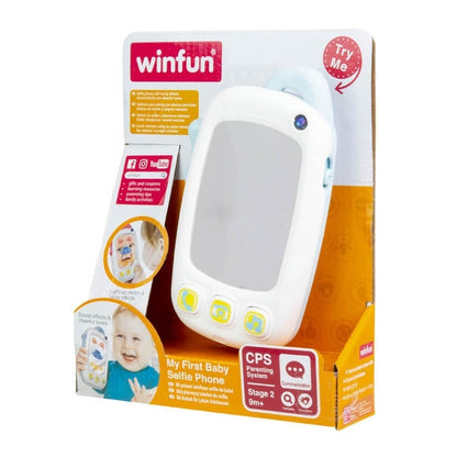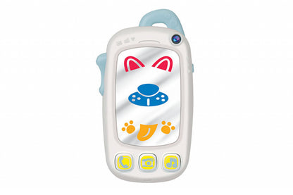 Selfie phone with easy-press buttons and light-up mirror Press the camera icon to see funny effects Includes phrases, sound effects, and cheerful tunes Press the side button for click-clack sounds