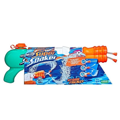 The Nerf Super Soaker Hydro Frenzy water blaster is designed with 2 tubes in the barrel and an adjustable nozzle to change the way the water blasts from the tubes, for wild 3-in-1 soaking fun! Unleash 2 parallel streams from the blaster, pull back the nozzle halfway to spray 2 wide-blasting streams, or pull the nozzle all the way back for wild water action as the tubes twist wildly in all directions, sending streams of water everywhere. Anyone in range can get soaked as the tubes flip and fly! Easy to us: Fill the tank, then pump the handle to start soaking. Tank capacity is 24 fluid ounces (709 milliliters).