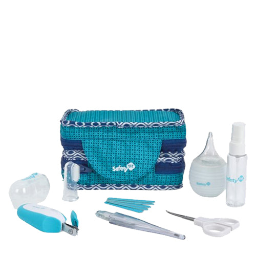 1 x Travel case 1 x Thermometer with plastic clean case 1 x Baby nail clippers 1 x Baby-safe nail scissors 1 x Nasal aspirator 1 x Spray bottle 1 x Gum brush/soother with plastic clean case 5 x Emery boards