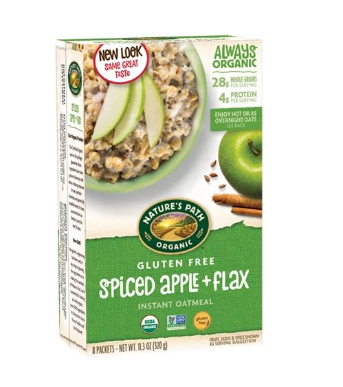 Ingredients: Gluten free rolled oats*, evaporated cane juice*, dried apple*, flax seeds*, flavor*, cinnamon*, sea salt. *Organic.