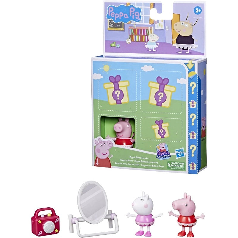 The Peppa’s Surprises Peppa’s Ballet Surprise toy set is very exciting! This adorable surprise pack includes a visible Peppa Pig figure all dressed in her ballet outfit, plus 3 hidden pieces, including a mystery figure and 2 ballet-themed accessories. Preschoolers and Peppa Pig fans will love unboxing this Peppa toy set and discovering all the storytelling fun inside.