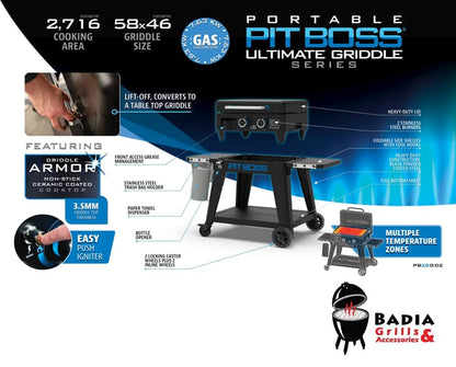 Innovation meets versatility with the Ultimate Plancha by Pit Boss® Grills. The Pit Boss® Ultimate 2-Burner Lift-Off Plancha perfectly blends power, portability, and precision to create a one-of-a-kind grilling machine that delivers a Bigger, Hotter, Heavier® outdoor cooking experience unlike anything on the market today. Outfitted with our all-new proprietary non-stick armored ceramic cooking surface, the Ultimate Plancha delivers an unrivaled user-friendly cooking experience. The first of its kind, this exclusive surface is ready to use straight out of the box and is a dream to clean, needing just a gentle wipe after use. As a bonus, the ceramic coating also protects the plancha from scratches and rust, keeping your unit looking better for longer. Completely portable, the Ultimate Plancha utilizes our easy lift-off technology for simple transport to any campsite or event. These units are aesthetically qualified to be the centerpiece of your backyard cooking arrangement, while also being flexible enough to hit the road and handle your cooking needs wherever you go. Featuring a robust 2-burner heating platform, the Ultimate Plancha is the perfect fit for whatever your needs may be. As practical as it is inventive, this line of planchas is our most versatile product to date.
