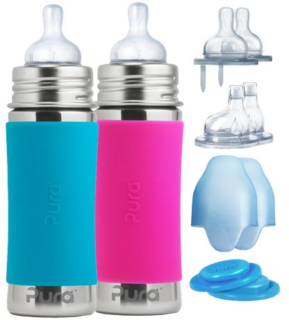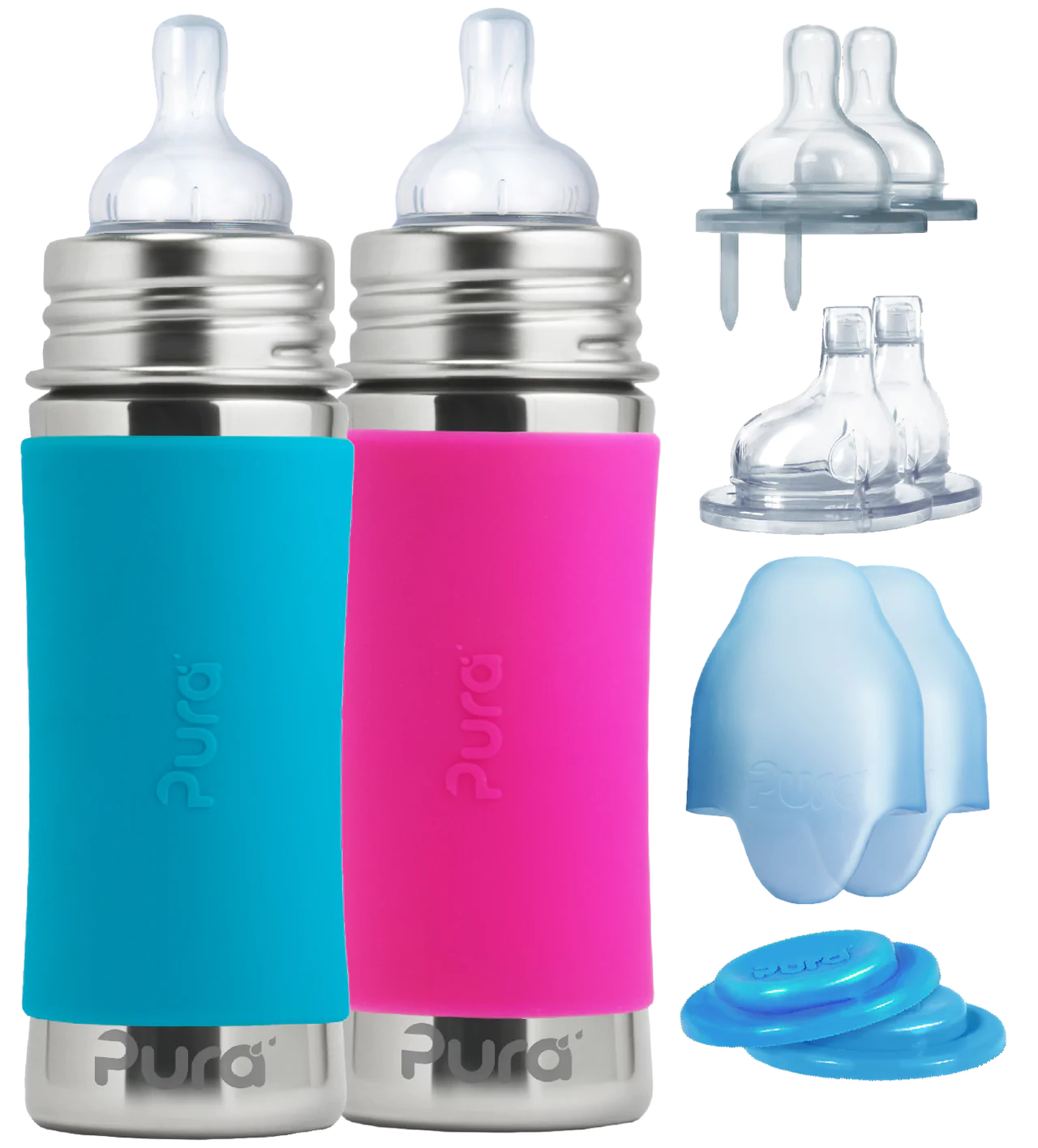 Baby Grows… Bottle Evolves™: These bottles easily convert into sippy bottles, straw bottles, or sport/water bottles by simply swapping the nipple out for another Pura silicone lid