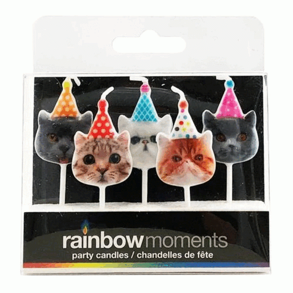 These paraffin party candles (traditional flame) are great on cakes and cupcakes. contains 5 different cats in party hats
